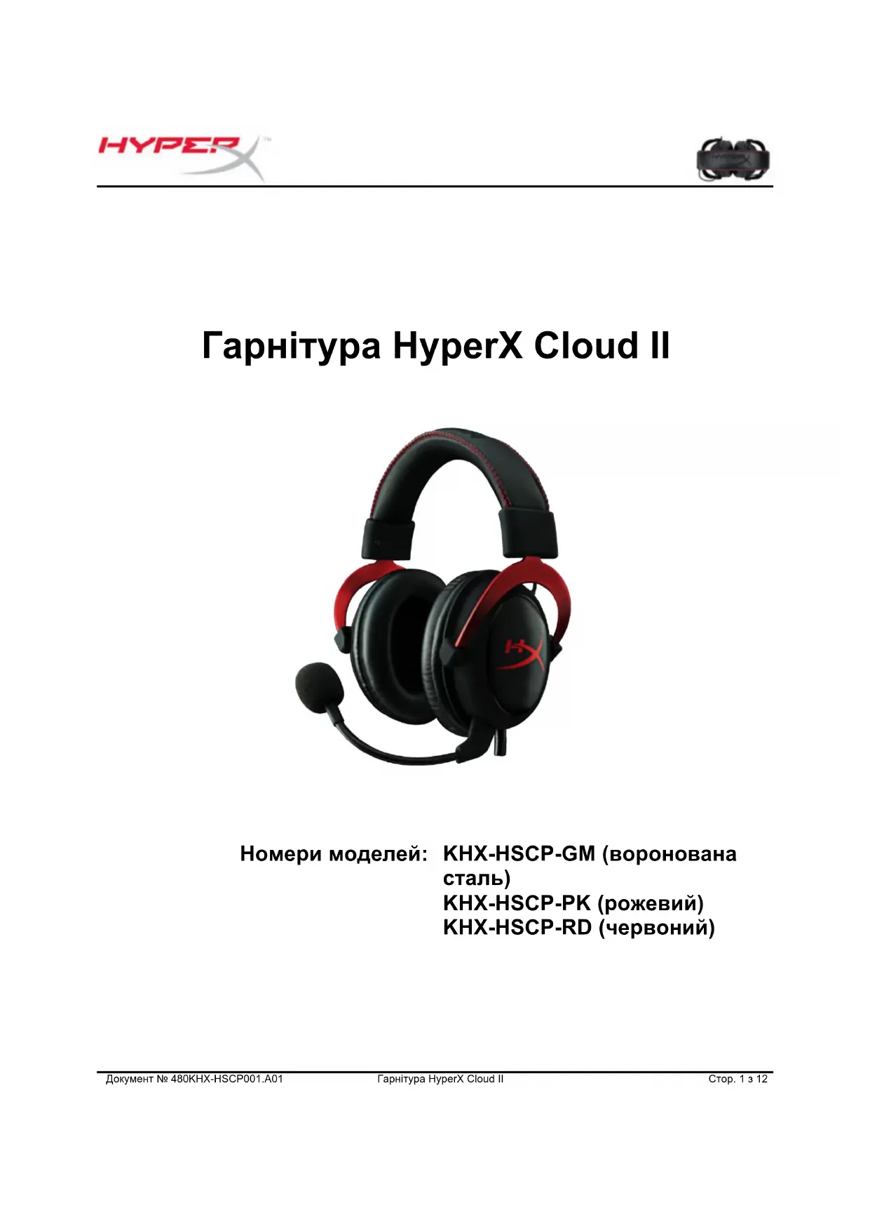 )Документ № 480KHX-HSCP001.A01 Гарнітура HyperX Cloud II Стор. 1 з 12