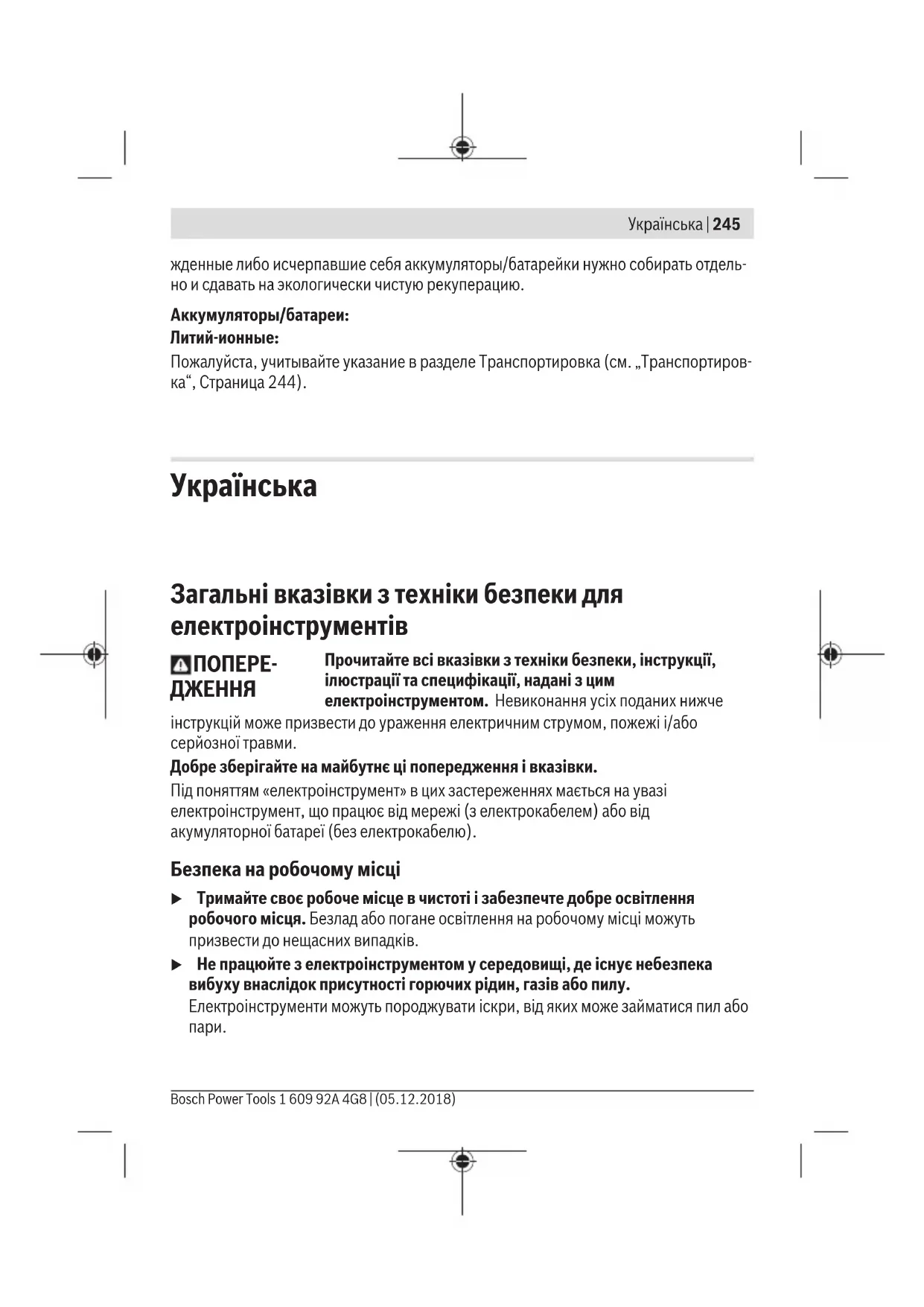 u Не зберігайте акумуляторну батарею, якою Ви саме не користуєтеся, поряд із канцелярськими скріпками, ключами, цвяхами, гвинтами та іншими невеликими металевими предметами, які можуть спричинити перемикання контактів. Коротке замикання між контактами акумуляторної батареї може спричиняти опіки або пожежу. 1 609 92A 4G8 | (05.12.2018) Bosch Power ToolsУкраїнська | 249 u При неправильному використанні з акумуляторної батареї може потекти рідина. Уникайте контакту з нею. При випадковому контакті промийте відповідне місце водою. Якщо рідина потрапила в очі, додатково зверніться до лікаря. Акумуляторна рідина може спричиняти подразнення шкіри або опіки. u Не використовуйте пошкоджені або модифіковані акумулятори або електроінструменти. Пошкоджені або модифіковані акумулятори можуть повестися неочікувано, що може призвести до пожежі, вибуху або ризику