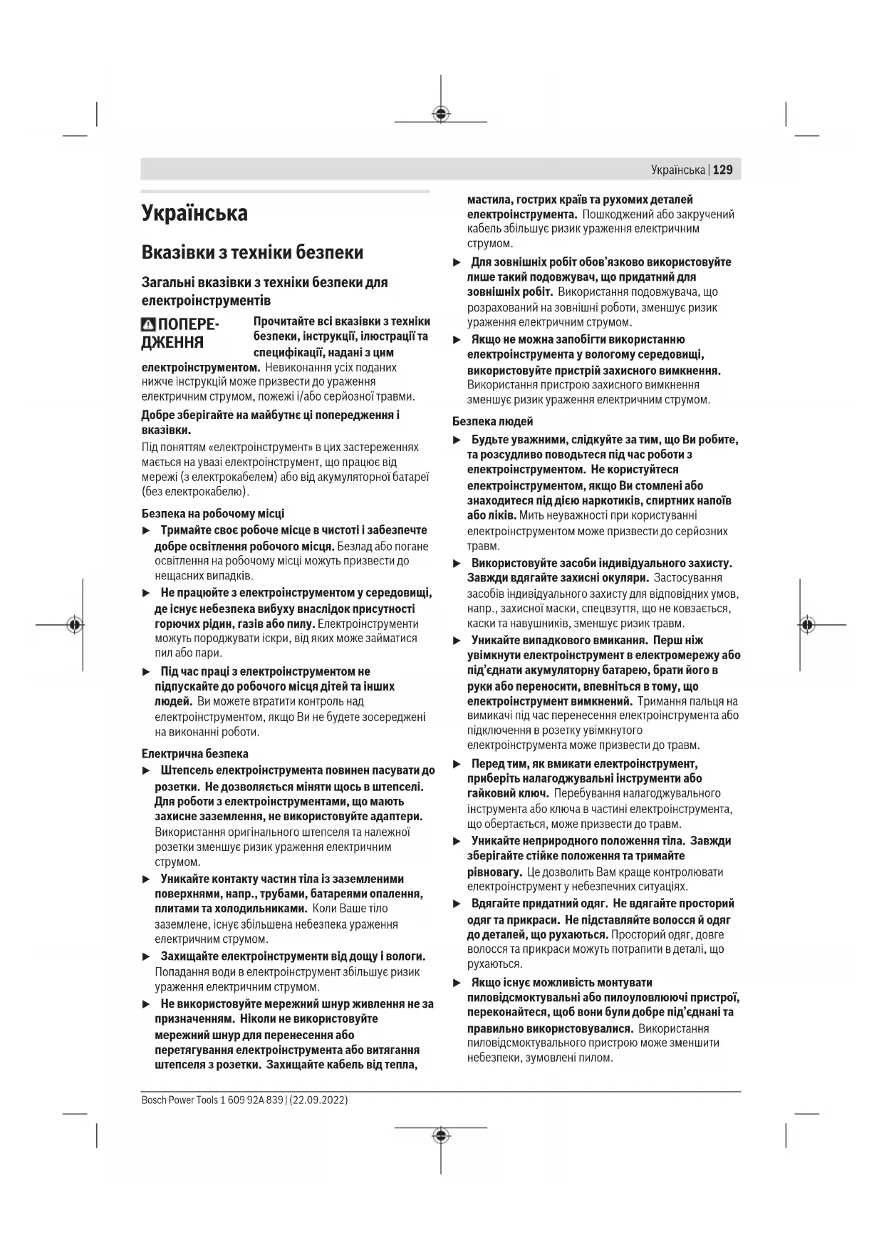 u Якщо існує можливість монтувати пиловідсмоктувальні або пилоуловлюючі пристрої, переконайтеся, щоб вони були добре під’єднані та правильно використовувалися. Використання пиловідсмоктувального пристрою може зменшити небезпеки, зумовлені пилом. Bosch Power Tools 1 609 92A 839 | (22.09.2022)130 | Українська u Добре знання електроінструментів, отримане в результаті частого їх використання, не повинно призводити до самовпевненості й ігнорування принципів техніки безпеки. Необережна дія може в одну мить призвести до важкої травми. Правильне поводження та користування електроінструментами u Не перевантажуйте електроінструмент. Використовуйте такий електроінструмент, що спеціально призначений для відповідної роботи. Зпридатним електроінструментом Ви з меншим ризиком отримаєте кращі результати роботи, якщо будете працювати в зазначеному діапазоні потужності. u Не користуйтеся електроінструментом з пошкодженим вимикачем. Електроінструмент, який не вмикається або не вимикається, є небезпечним і його треба відремонтувати. u Перед тим, як регулювати що-небудь в електроінструменті, міняти приладдя або ховати електроінструмент, витягніть штепсель із розетки та/або витягніть акумуляторну батарею. Ці попереджувальні заходи з техніки безпеки зменшують ризик випадкового запуску електроінструмента. u Ховайте електроінструменти, якими Ви саме не користуєтеся, від дітей. Не дозволяйте користуватися електроінструментом особам, що не знайомі з його роботою або не читали ці вказівки. Використання електроінструментів недосвідченими особами може бути небезпечним. u Старанно доглядайте за електроінструментами і приладдям. Перевіряйте, щоб рухомі деталі електроінструмента були правильно розташовані та не заїдали, не були пошкодженими або у будь- якому іншому стані, який міг би вплинути на функціонування електроінструмента. Пошкоджені електроінструменти потрібно відремонтувати, перш ніж користуватися ними знову. Велика кількість нещасних випадків спричиняється поганим доглядом за електроінструментами. u Тримайте різальні інструменти нагостреними та в чистоті. Старанно доглянуті різальні інструменти з гострим різальним краєм менше застряють та легші в експлуатації. u Використовуйте електроінструмент, приладдя до нього, робочі інструменти тощо відповідно до цих вказівок. Беріть до уваги при цьому умови роботи та специфіку виконуваної роботи. Використання електроінструментів для робіт, для яких вони не передбачені, може призвести до небезпечних