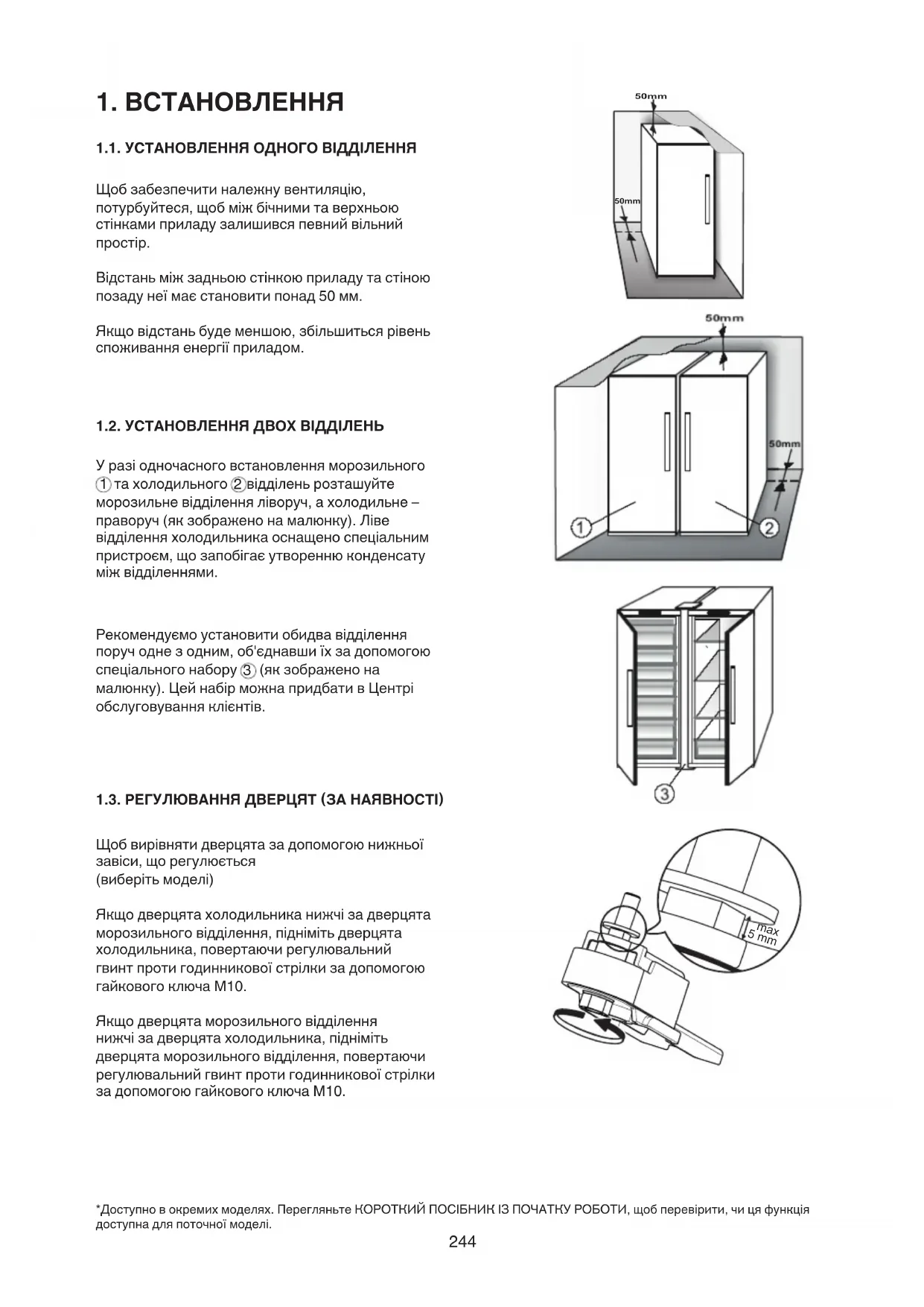 Відстаньміжзадньоюстінкоюприладутастіною позадунеїмаєстановитипонад50мм. Якщовідстаньбудеменшою,збільшитьсярівень споживанняенергіїприладом. 1.2. УСТАНОВЛЕННЯ ДВОХ ВІДДІЛЕНЬ Уразіодночасноговстановленняморозильного