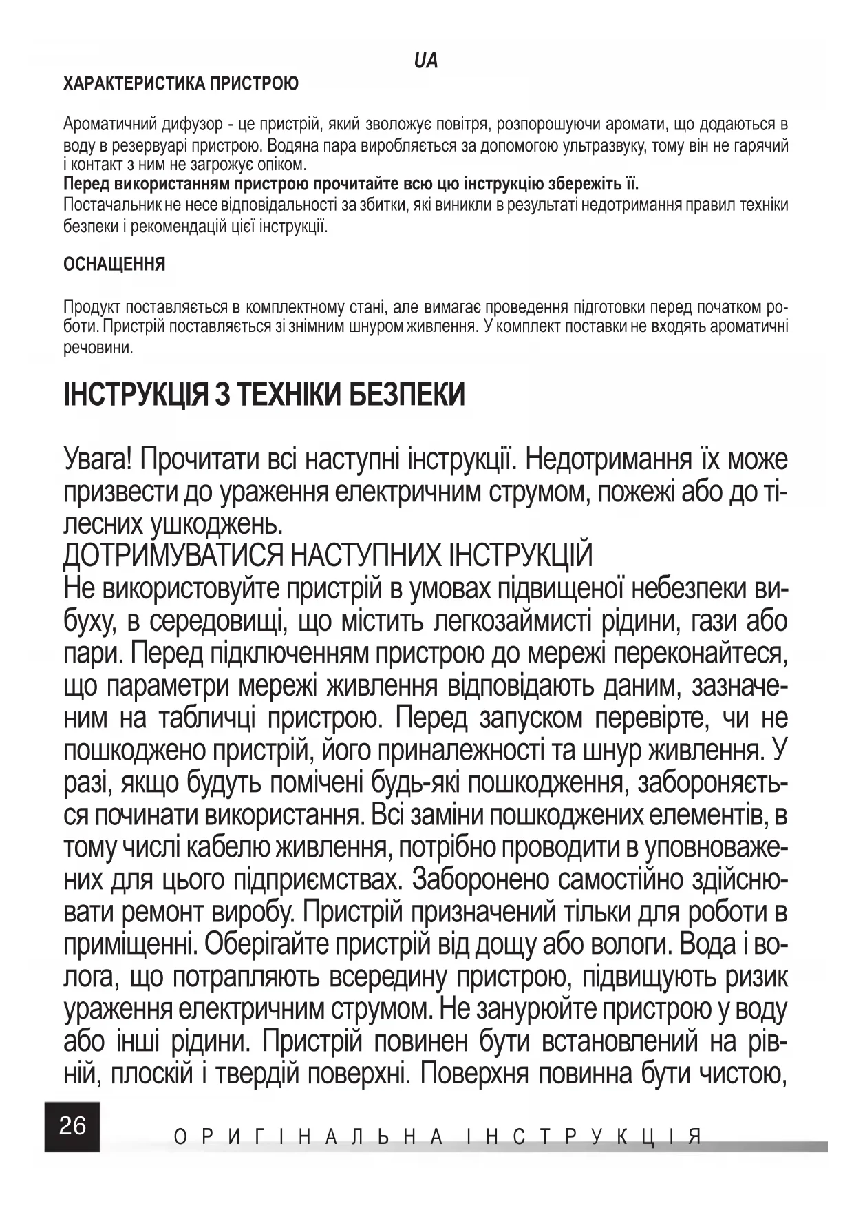 ХАРАКТЕРИСТИКА ПРИСТРОЮ Ароматичний дифузор - це пристрій, який зволожує повітря, розпорошуючи аромати, що додаються в воду в резервуарі пристрою. Водяна пара виробляється за допомогою ультразвуку, тому він не гарячий і контакт з ним не загрожує опіком. Перед використанням пристрою прочитайте всю цю інструкцію збережіть її. Постачальник не несе відповідальності за збитки, які виникли в результаті недотримання правил техніки безпеки і рекомендацій цієї інструкції.