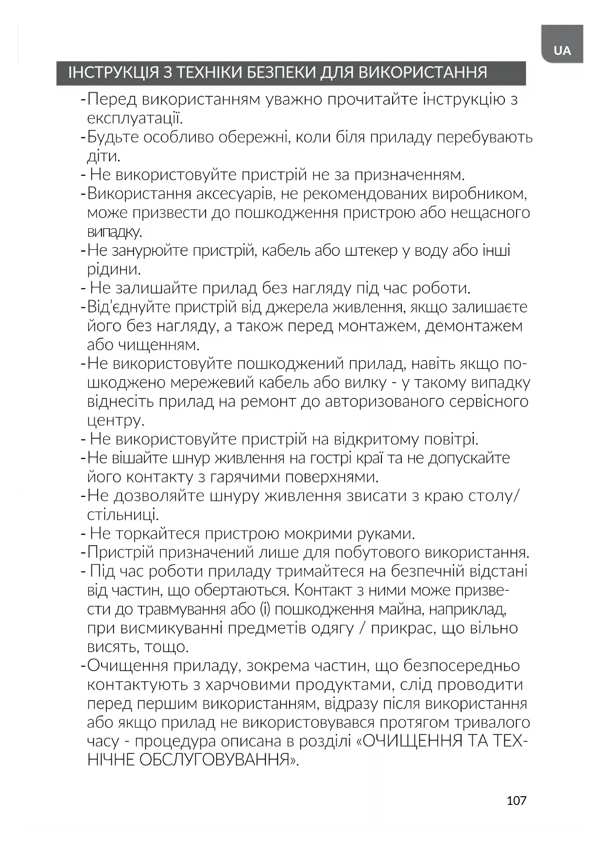 Очищення приладу, зокрема частин, що безпосередньо контактують з харчовими продуктами, слід проводити перед першим використанням, відразу після використання або якщо прилад не використовувався протягом тривалого часу - процедура описана в розділі «ОЧИЩЕННЯ ТА ТЕХ- НІЧНЕ ОБСЛУГОВУВАННЯ».108