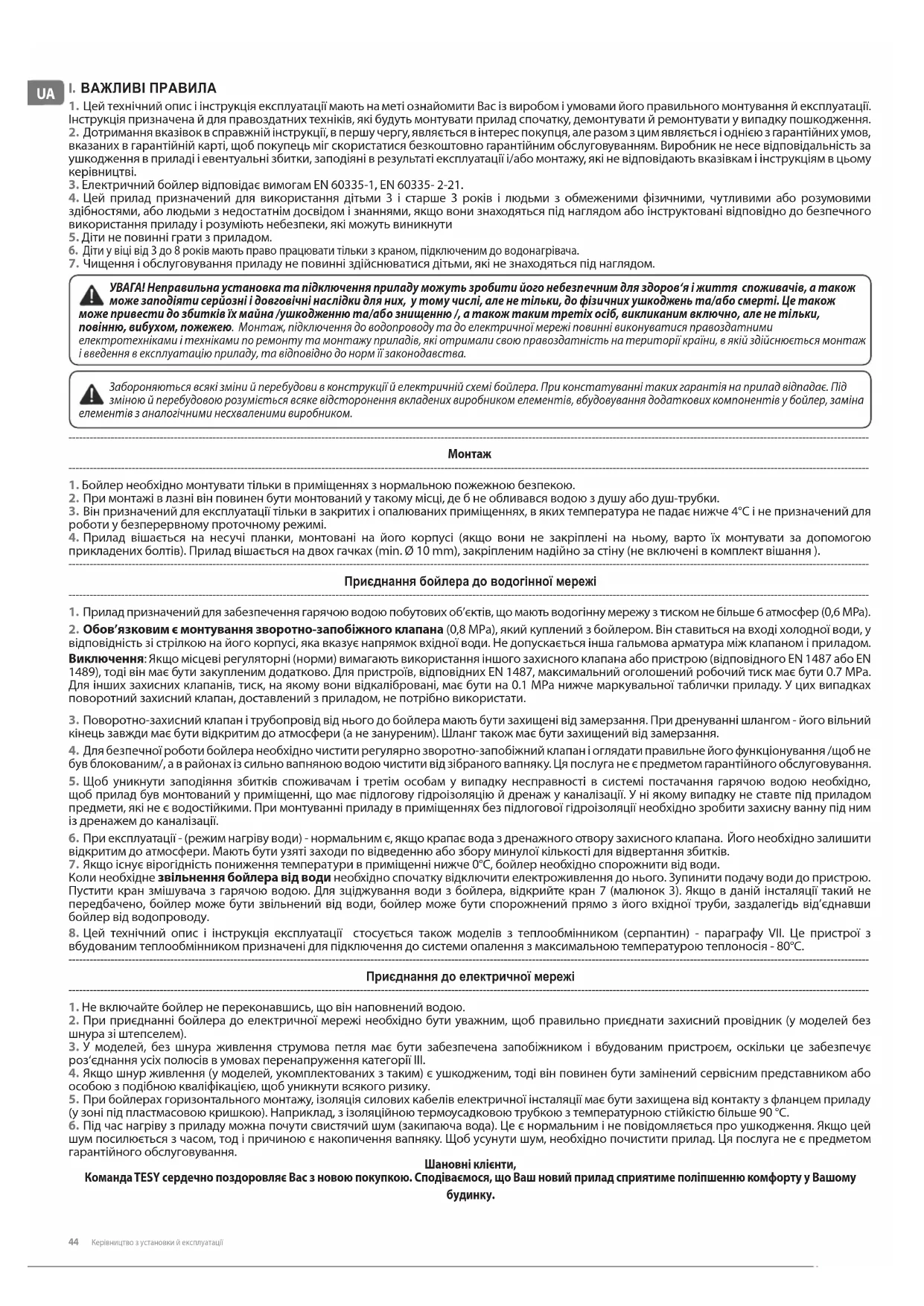 УВАГА! Неправильна установка та підключення приладу можуть зробити його небезпечним для здоров‘я і життя споживачів, а також може заподіяти серйозні і довговічні наслідки для них, у тому числі, але не тільки, до фізичних ушкоджень та/або смерті. Це також може привести до збитків їх майна /ушкодженню та/або знищенню /, а також таким третіх осіб, викликаним включно, але не тільки, повінню, вибухом, пожежею. Монтаж, підключення до водопроводу та до електричної мережі повинні виконуватися правоздатними електротехніками і техніками по ремонту та монтажу приладів, які отримали свою правоздатність на території країни, в якій здійснюється монтаж і введення в експлуатацію приладу, та відповідно до норм її законодавства. Забороняються всякі зміни й перебудови в конструкції й електричній схемі бойлера. При констатуванні таких гарантія на прилад відпадає. Під зміною й перебудовою розуміється всяке відсторонення вкладених виробником елементів, вбудовування додаткових компонентів у бойлер, заміна елементів з аналогічними несхваленими виробником.