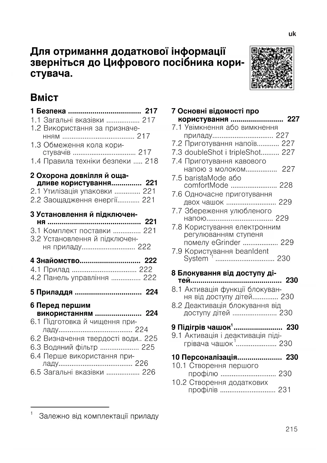 Будь ласка, уважно прочитайте цю інструкцію. ¡ Збережіть інструкцію й інформацію про прилад для пізнішого користування або для наступного власника приладу. ¡ Не підключайте прилад, якщо його пошкоджено під час транспортування. 1.2 Використання за призначенням Користуйтеся приладом лише за таких умов: ¡ для приготування гарячих напоїв. ¡ у приватних домогосподарствах і в закритих приміщеннях побутового призначення. ¡ на висоті щонайбільше 2000м над рівнем моря. 1.3 Обмеження кола користувачів Діти віком від 8років, а також особи з обмеженими фізичними, сенсорними або розумовими здібностями чи з браком досвіду та/або знань можуть користуватися цим приладом тільки під наглядом або після отримання вказівок із безпечного кори- стування приладом і після того, як вони усвідомили можливі пов’язані з цим небезпеки. Дітям заборонено гратися з приладом. Дітям можна чистити й обслуговувати прилад лише з 8-річного віку й під наглядом дорослих. Прилад і кабель живлення слід берегти від дітей віком до 8років.uk Безпека