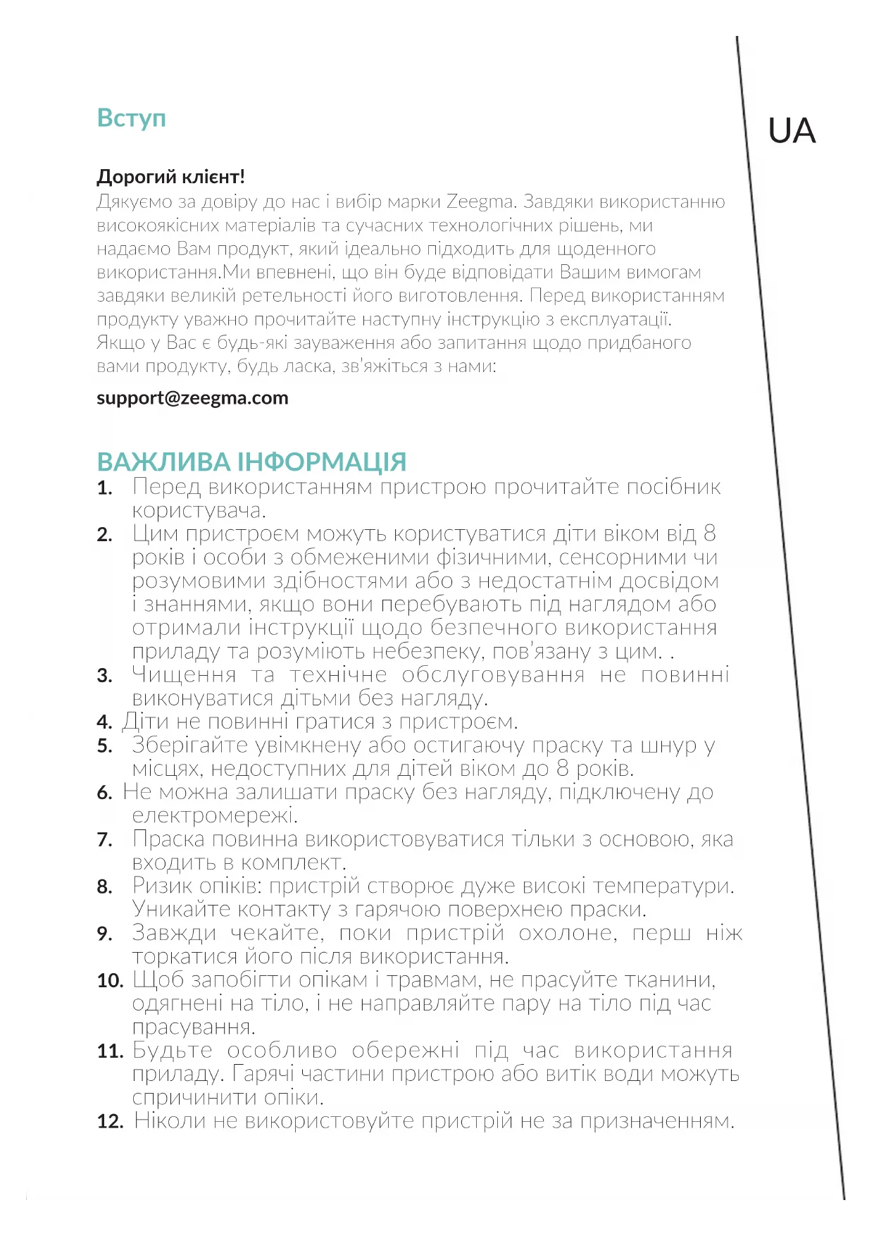 Якщо синтетичні тканини прасувати при надто високій температурі, існує ризик пошкодження тканини, а також покриття праски залишками синтетичного матеріалу. Щоб видалити залишки синтетики, увімкніть прилад, а потім пропрасуйте шматок бавовняної тканини. Фотографії наведені лише для ілюстрації, реальний вигляд виробів може відрізнятися від представленого на фотографіях.LT Įvedimas Gerbiamas Kliente! Dėkojame, kad pasikėjote mumis ir pasirinkote „Zeegma“ prekės ženklą. Mes siūlome Jums produktą, kuris dėl naudojamų aukštos kokybės medžia- gų ir šiuolaikiškų techninių sprendimų puikiai nka kasdieniam naudojimui. Esame kri, kad dėl kruopštaus pagaminimo, jis aks Jūsų reikalavimus. Prieš naudodami gaminį, adžiai perskaitykite šias instrukcijas. Jei turite komentarų ar klausimų apie įsigytą produktą, nedvejodami susisie- kite su mumis: support@zeegma.com SVARBI INFORMACIJA