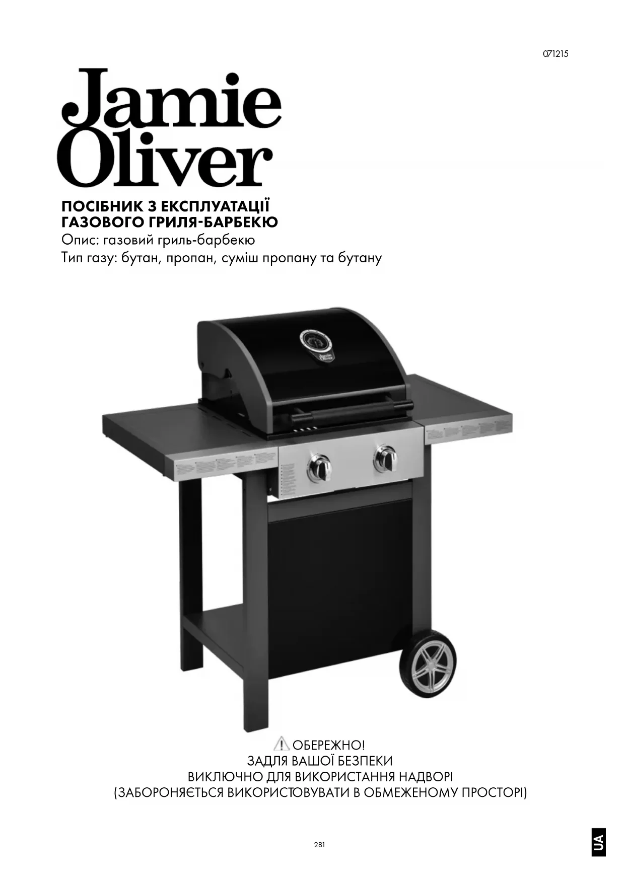 Уважно прочитайте ці інструкції та переконайтеся в тому, що ваше барбекю встановлено та зібрано належним чином й обслуговується та використовується згідно з цими інструкціями. Недотримання цих вимог може призвести до важкої травми або матеріальних збитків. Щодо питань, пов’язаних зі збіркою або експлуатацією цього барбекю, звертайтеся до свого дилера, постачальника газу, виробника, агента або до розділу Support (Підтримка) на сайті www.jamieoliverbbq.com. Примітки для користувача «ВИКОРИСТОВУВАТИ ЛИШЕ НАДВОРІ». «ПЕРЕД ВИКОРИСТАННЯМ БАРБЕКЮ ПРОЧИТАЙТЕ ЦІ ІНСТРУКЦІЇ». «ОБЕРЕЖНО! ВІДКРИТІ ЧАСТИНИ МОЖУТЬ СИЛЬНО НАГРІВАТИСЯ. БЕРЕГТИ ВІД ДІТЕЙ». «ЗАБОРОНЯЄТЬСЯ ПЕРЕСУВА