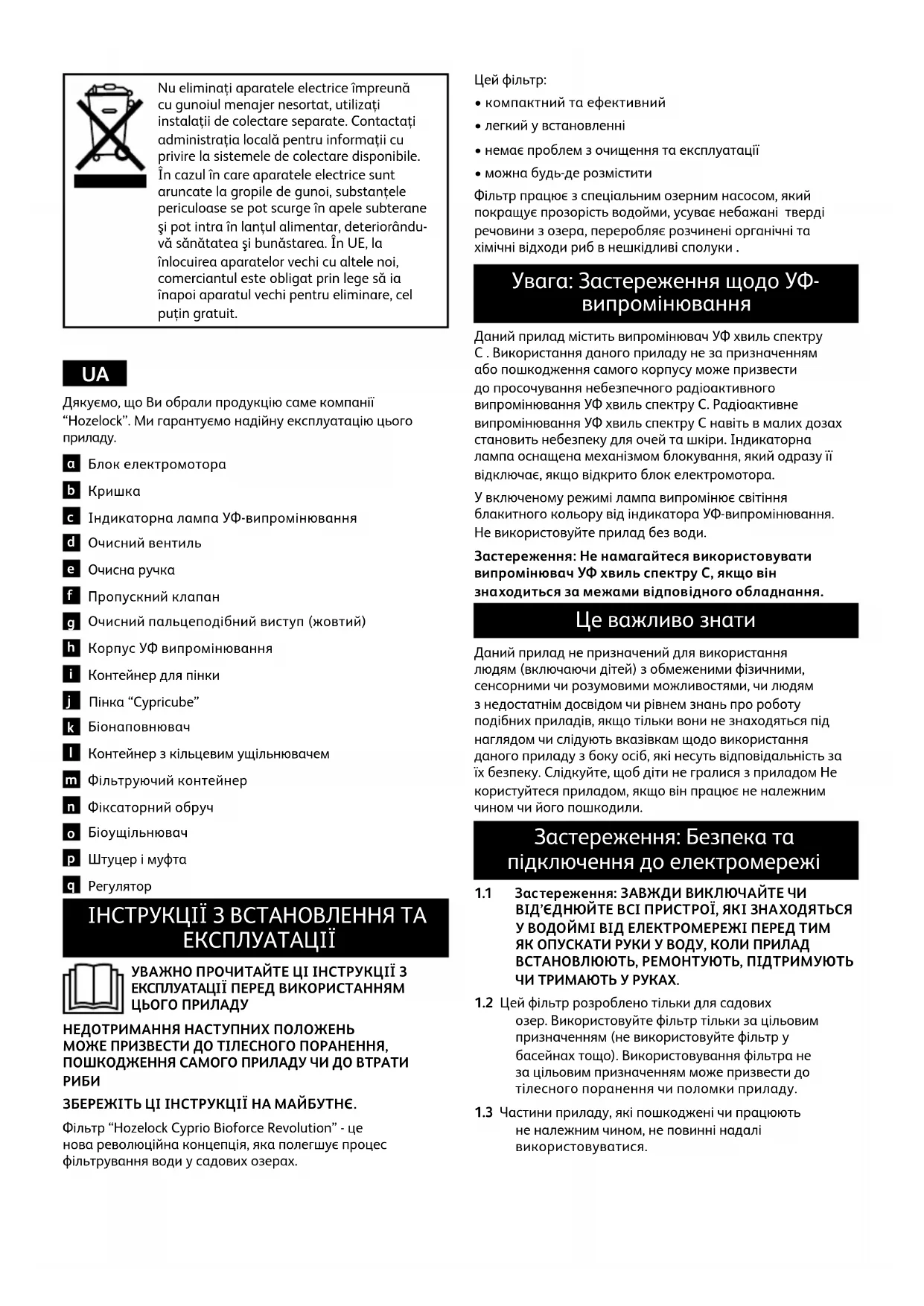 ЗБЕРЕЖІТЬ ЦІ ІНСТРУКЦІЇ НА МАЙБУТНЄ. Фільтр “Hozelock Cyprio Bioforce Revolution” - це нова революційна концепція, яка полегшує процес фільтрування води у садових озерах. Цей фільтр: