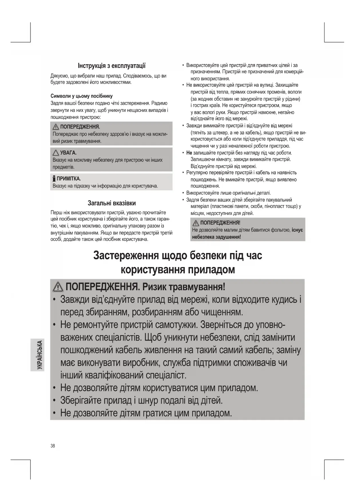 Вказує на підказку чи інформацію для користувача. Загальні вказівки Перш ніж використовувати пристрій, уважно прочитайте цей посібник користувача і зберігайте його, а також гаран- тію, чек і, якщо можливо, оригінальну упаковку разом із внутрішнім пакуванням. Якщо ви передасте пристрій третій особі, додайте також цей посібник користувача. Застереження щодо безпеки під час користування приладом ПОПЕРЕДЖЕННЯ. Ризик травмування!