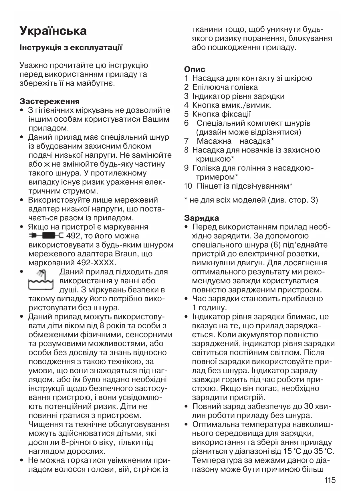ї голівки перед кожним вико- ристанням мінімізує ризик інфікування. У випадку виникнення сумнівів щодо використання даного приладу прокон- сультуйтеся з лікарем. Даний прилад можна використовувати тільки після консультації лікаря щодо таких випад- ків: екзема, ранки, інфекційні ураження шкіри, такі як фолікуліт (запалення волосяного фолікула), варикозне роз- ширення вен, круглі родимки, зниження імунітету шкіри, наприклад, при цукро- вому діабеті, під час вагітності, при хво- робі Рейно, гемофілії, імунодефіциті або кандидозі. Гоління (див. малюнок секція В) Голівка для гоління (9) призначена для швидкого і чистого гоління ніг, під пахвами та зони бікіні. Для контурного тримінгу та підстригання волосся до 5 мм до голівки для гоління додається насадка-тример. Використовуйте прилад тільки на сухій шкірі та зі швид- кістю II. а Гоління: виберіть « ». b Контур підстригання: виберіть « ». с Видалення волосся довжиною до 5 мм: виберіть « » і приєднайте насадку-тример (I). 91004737_SE_5-5xx_EMEA_S6-128.indd 11791004737_SE_5-5xx_EMEA_S6-128.indd 117 03.08.16 11:4703.08.16 11:47 CSS APPROVED Effective Date 4Aug2016 GMT - Printed 27Sep2016 Page 117 of 12811 8 d Очищення: Постукайте по метале- вій частині бритви на рівній поверхні. Не очищуйте її за допомогою щітки, ви можете пошкодити металеву