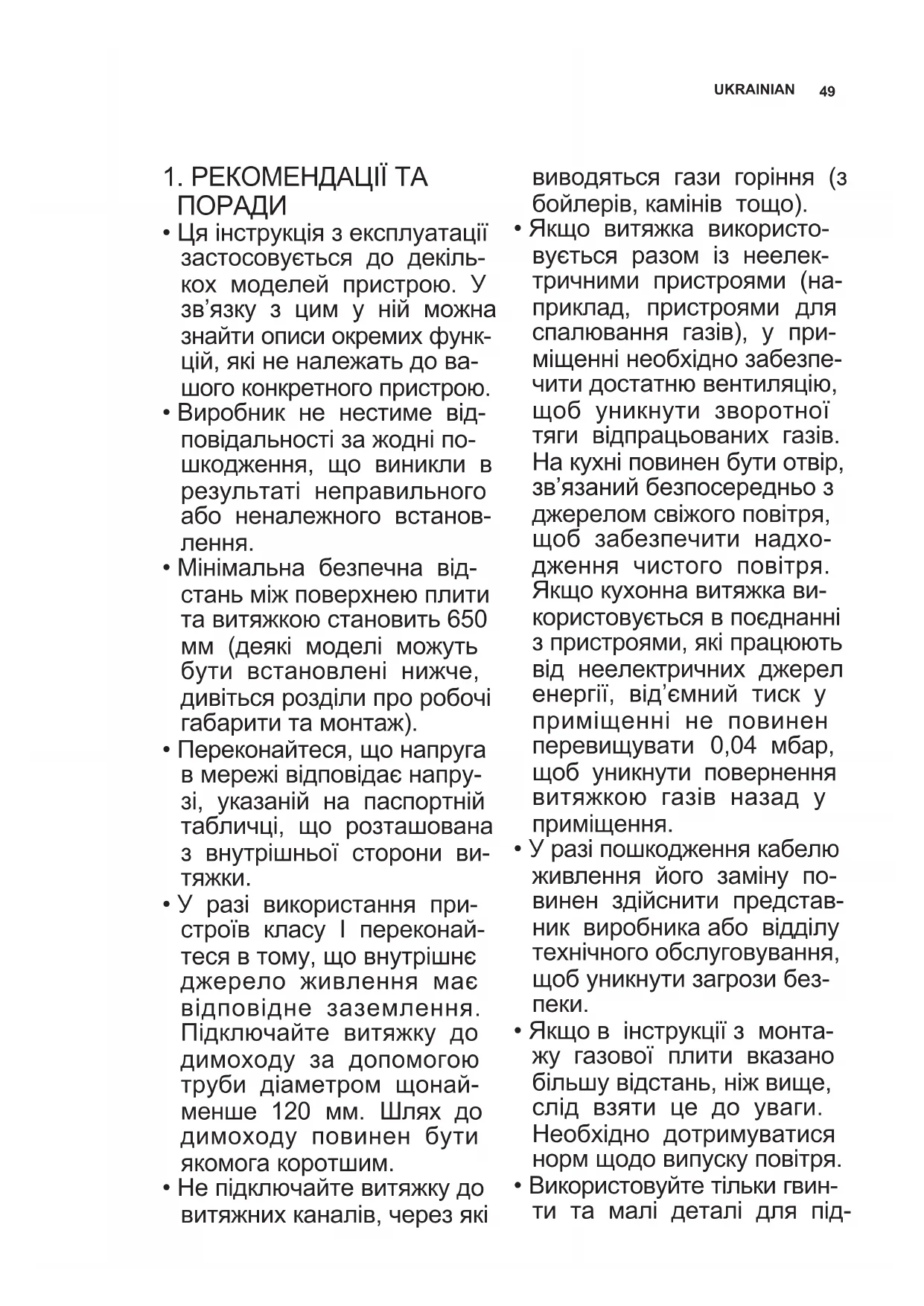 - У разі використання при- строїв класу I переконай- теся в тому, що внутрішнє джерело живлення має відповідне заземлення. Підключайте витяжку до димоходу за допомогою труби діаметром щонай- менше 120 мм. Шлях до димоходу повинен бути якомога коротшим.
