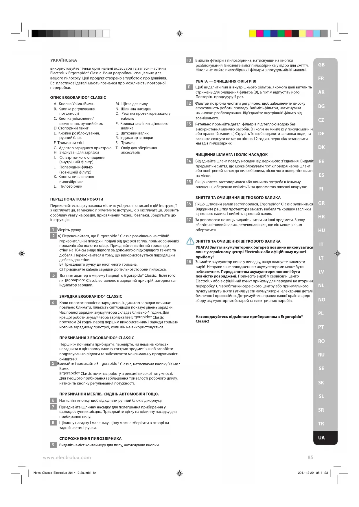 Nova_Classic_Electrolux_2017-12-20.indd 84 2017-12-20 08:11:22УКРАЇНСЬКА використовуйте тільки оригінальні аксесуари та запасні частини Electrolux Ergorapido® Classic. Вони розроблені спеціально для вашого пилососу. Цей продукт створено з турботою про довкілля. Всі пластикові деталі мають позначки про можливість повторної