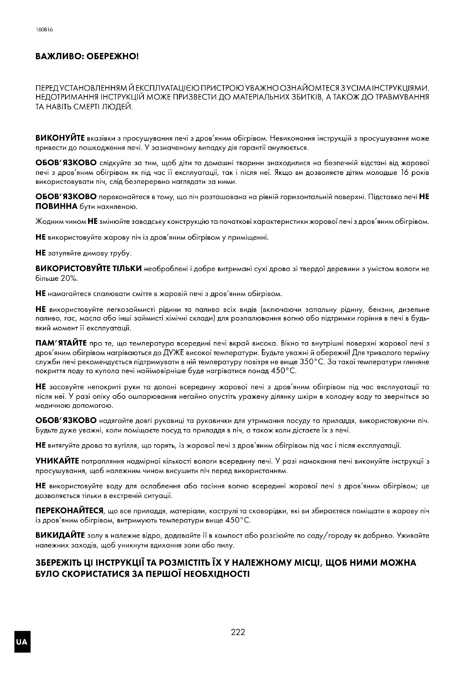 ВАЖЛИВО: ОБЕРЕЖНО! ПЕРЕД УСТАНОВЛЕННЯМ Й ЕКСПЛУАТАЦІЄЮ ПРИСТРОЮ УВАЖНО ОЗНАЙОМТЕСЯ З УСІМА ІНСТРУКЦІЯМИ НЕДОТРИМАННЯ ІНСТРУКЦІЙ МОЖЕ ПРИЗВЕСТИ ДО МАТЕРІАЛЬНИХ ЗБИТКІВ, А ТАКОЖ ДО ТРАВМУВАННЯ ТА НАВІТЬ СМЕРТІ ЛЮДЕЙ ВИКОНУЙТЕ вказівки з просушування печі з дров’яним обігрівом Невиконання інструкцій з просушування може привести до пошкодження печі У зазначеному випадку дія гарантії анулюється ОБОВ’ЯЗКОВО слідкуйте за тим, щоб діти та домашні тварини знаходилися на безпечній відстані від жарової печі з дров’яним обігрівом як під час її експлуатації, так і після неї Якщо ви дозволяєте дітям молодше 16років використовувати піч, слід безперервно наглядати за ними ОБОВ’ЯЗКОВО переконайтеся в тому, що піч розташована на рівній горизонтальній поверхні Підставка печі НЕ ПОВИННА бути нахиленою Жодним чином НЕ змінюйте заводську конструкцію та початкові характеристики жарової печі з дров’яним обігрівом НЕ використовуйте жарову піч із дров’яним обігрівом у приміщенні НЕ затуляйте димову трубу ВИКОРИСТОВУЙТЕ ТІЛЬКИ необроблені і добре витримані сухі дрова зі твердої деревини з умістом вологи не більше 20% НЕ намагайтеся спалювати сміття в жаровій печі з дров’яним обігрівом НЕ використовуйте легкозаймисті рідини та паливо всіх видів (включаючи запальну рідину, бензин, дизельне паливо, гас, масла або інші займисті хімічні склади) для розпалювання вогню або підтримки горіння в печі в будь- який момент її експлуатації ПАМ’ЯТАЙТЕ про те, що температура всередині печі вкрай висока Вікно та внутрішні поверхні жарової печі з дров’яним обігрівом нагріваються до ДУЖЕ високої температури Будьте уважні й обережні! Для тривалого терміну служби печі рекомендується підтримувати в ній температуру повітря не вище 350°C За такої температури глиняне покриття поду та купола печі найімовірніше буде нагріватися понад 450°C НЕ засовуйте непокриті руки та долоні всередину жарової печі з дров’яним обігрівом під час експлуатації та після неї У разі опіку або ошпарювання негайно опустіть уражену ділянку шкіри в холодну воду та зверніться за медичною допомогою ОБОВ’ЯЗКОВО надягайте довгі рукавиці та рукавички для утримання посуду та приладдя, використовуючи піч Будьте дуже уважні, коли поміщаєте посуд та приладдя в піч, а також коли дістаєте їх з печі НЕ витягуйте дрова та вугілля, що горять, із жарової печі з дров’яним обігрівом під час і після експлуатації УНИКАЙТЕ потрапляння надмірної кількості вологи всередину печі У разі намокання печі виконуйте інструкції з просушування, щоб належним чином висушити піч перед використанням НЕ використовуйте воду для ослаблення або гасіння вогню всередині жарової печі з дров’яним обігрівом; це дозволяється тільки в екстреній ситуації ПЕРЕКОНАЙТЕСЯ, що все приладдя, матеріали, каструлі та сковорідки, які ви збираєтеся поміщати в жарову піч із дров’яним обігрівом, витримують температури вище 450°C ВИКИДАЙТЕ золу в належне відро, додавайте її в компост або розсіюйте по саду/городу як добриво Уживайте належних заходів, щоб уникнути вдихання золи або пилу ЗБЕРЕЖІТЬ ЦІ ІНСТРУКЦІЇ ТА РОЗМІСТІТЬ ЇХ У НАЛЕЖНОМУ МІСЦІ , ЩОБ НИМИ МОЖНА БУЛО СКОРИСТАТИСЯ ЗА ПЕРШОЇ НЕОБХІДНОСТІ 160816UA