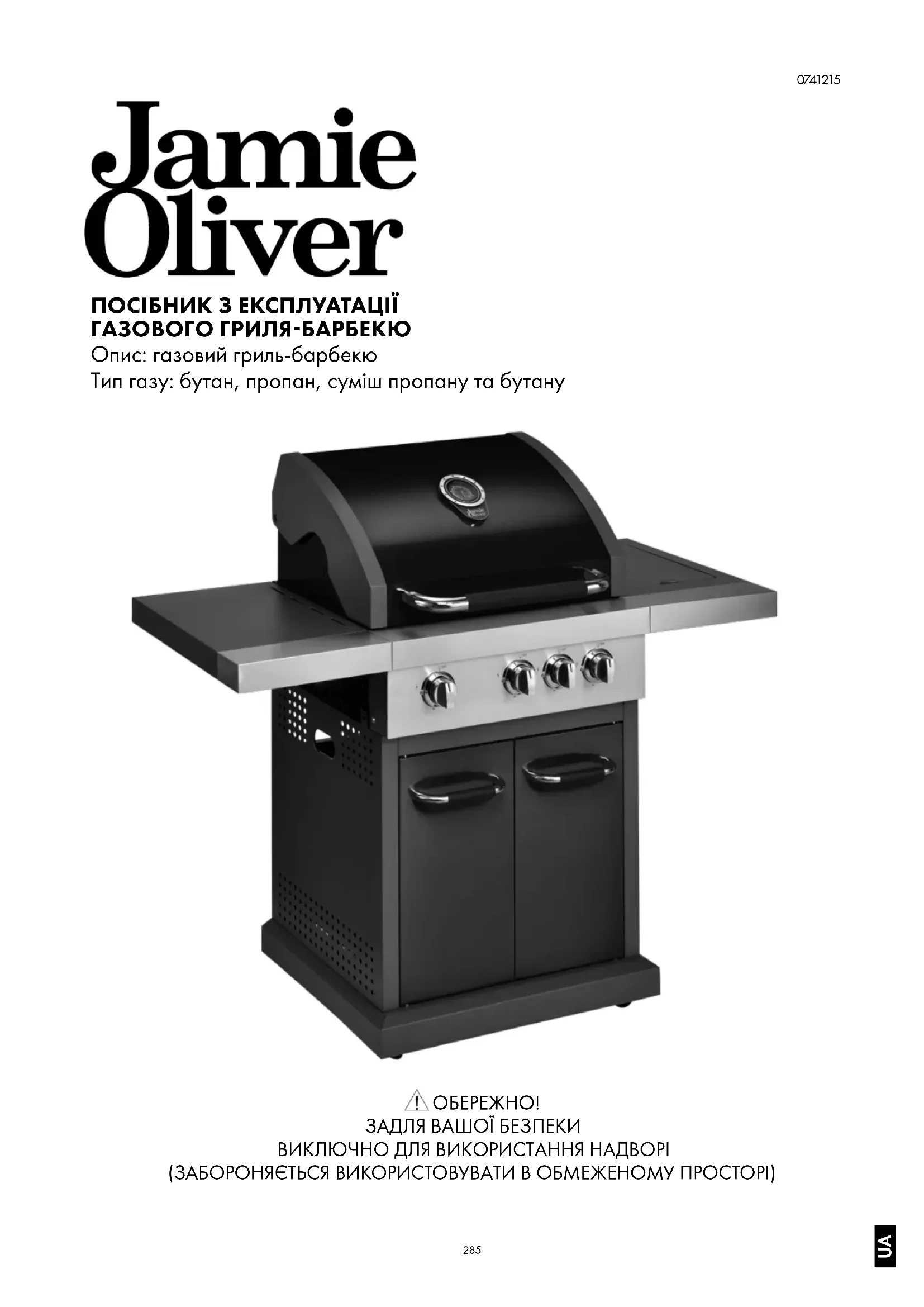Уважно прочитайте ці інструкції та переконайтеся в тому, що ваше барбекю встановлено та зібрано належним чином й обслуговується та використовується згідно з цими інструкціями. Недотримання цих вимог може призвести до важкої травми або матеріальних збитків. Щодо питань, пов’язаних зі збіркою або експлуатацією цього барбекю, звертайтеся до свого дилера, постачальника газу, виробника, агента або до розділу Support (Підтримка) на сайті www.jamieoliverbbq.com. Примітки для користувача «ВИКОРИСТОВУВАТИ ЛИШЕ НАДВОРІ». «ПЕРЕД ВИКОРИСТАННЯМ БАРБЕКЮ ПРОЧИТАЙТЕ ЦІ ІНСТРУКЦІЇ». «ОБЕРЕЖНО! ВІДКРИТІ ЧАСТИНИ МОЖУТЬ СИЛЬНО НАГРІВАТИСЯ. БЕРЕГТИ ВІД ДІТЕЙ». «ЗАБОРОНЯЄТЬСЯ ПЕРЕСУВАТИ БАРБЕКЮ ПІД ЧАС ВИКОРИСТАННЯ». «ПІСЛЯ ЗАВЕРШЕННЯ ВИКОРИСТАННЯ ПЕРЕКРИЙТЕ ПОСТАЧАННЯ ГАЗУ З ГАЗОВОГО БАЛОНА». ТЕХНІЧНА ІНФОРМАЦІЯ НОМЕР МОДЕЛІ: PRO 3S (3основні пальники + бічний пальник)