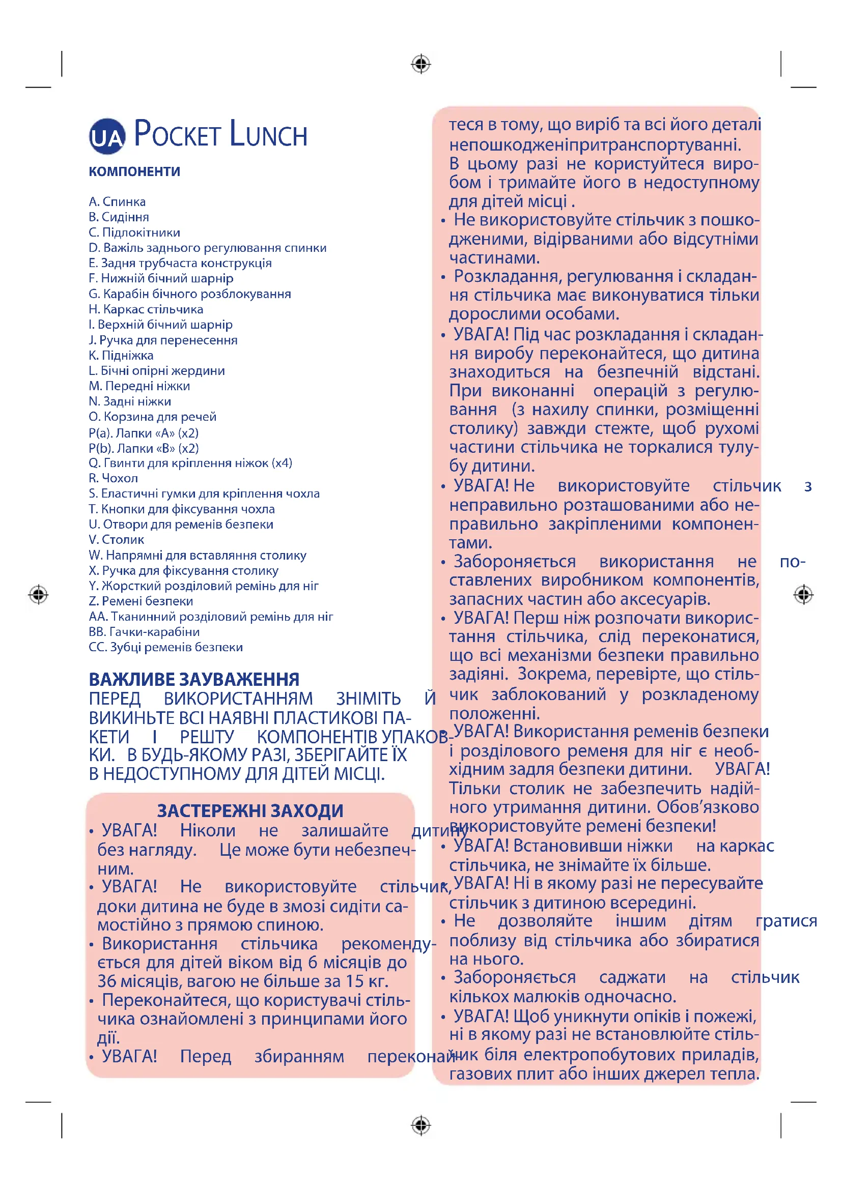 Y. Жорсткий розділовий ремінь для ніг Z. Ремені безпеки AA. Тканинний розділовий ремінь для ніг BB. Гачки-карабіни CC. Зубці ременів безпеки ВАЖЛИВЕ ЗАУВАЖЕННЯ ПЕРЕД ВИКОРИСТАННЯМ ЗНІМІТЬ Й ВИКИНЬТЕВСІНАЯВНІПЛАСТИКОВІПА- КЕТИ І РЕШТУ КОМПОНЕНТІВУПАКОВ- КИ.ВБУДЬ-ЯКОМУРАЗІ,ЗБЕРІГАЙТЕЇХ ВНЕДОСТУПНОМУДЛЯДІТЕЙМІСЦІ. ЗАСТЕРЕЖНІ ЗАХОДИ