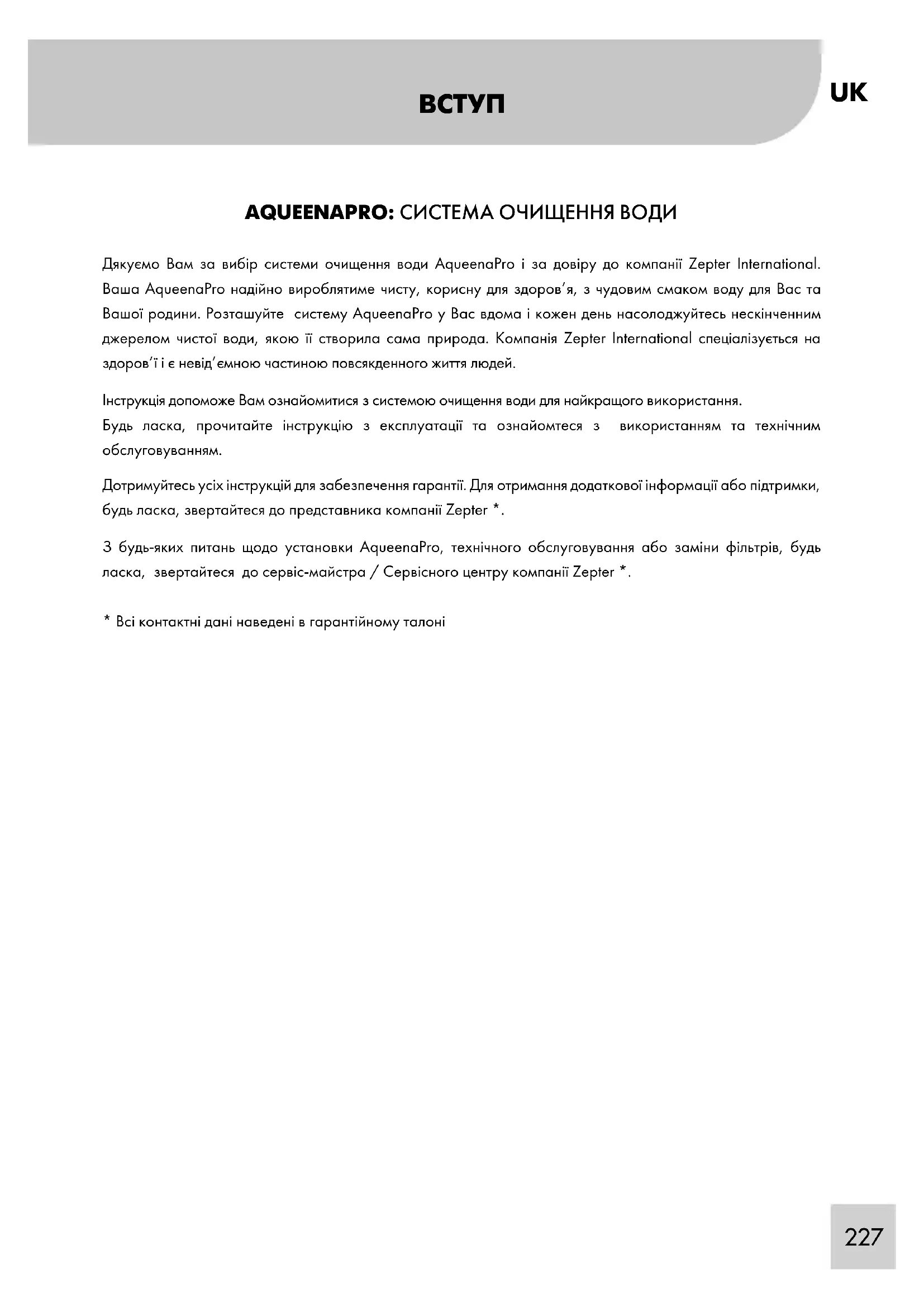 AQUEENAPRO: СИСТЕМА ОЧИЩЕННЯ ВОДИ Дякуємо Вам за вибір системи очищення води AqueenaPro і за довіру до компанії Zepter International. Ваша AqueenaPro надійно вироблятиме чисту, корисну для здоров’я, з чудовим смаком воду для Вас та Вашої родини. Розташуйте систему AqueenaPro у Вас вдома і кожен день насолоджуйтесь нескінченним джерелом чистої води, якою її створила сама природа. Компанія Zepter International спеціалізується на здоров’ї і є невід’ємною частиною повсякденного життя людей. Інструкція допоможе Вам ознайомитися з системою очищення води для найкращого використання. Будь ласка, прочитайте інструкцію з експлуатації та ознайомтеся з використанням та технічним обслуговуванням. Дотримуйтесь усіх інструкцій для забезпечення гарантії. Для отримання додаткової інформації або підтримки, будь ласка, звертайтеся до представника компанії Zepter *. З будь-яких питань щодо установки AqueenaPro, технічного обслуговування або заміни фільтрів, будь ласка, звертайтеся до сервіс-майстра / Сервісного центру компанії Zepter *.