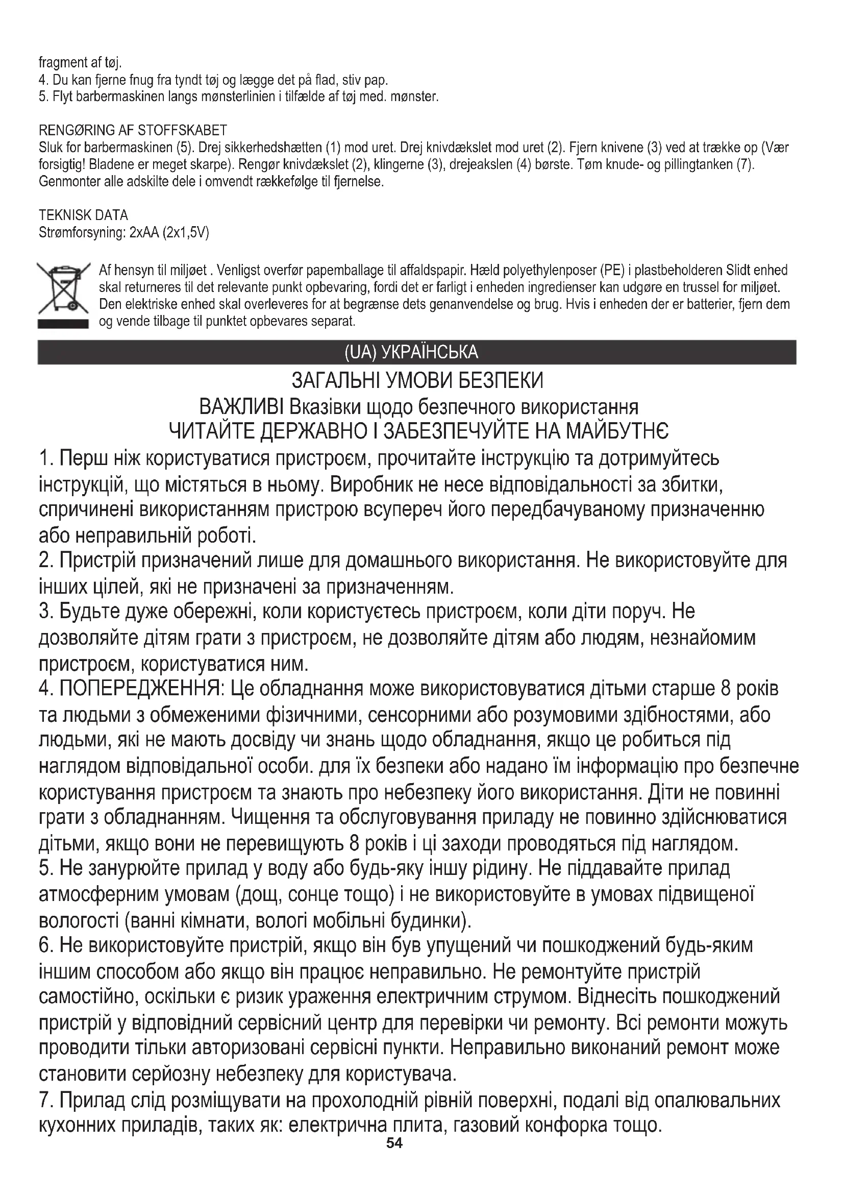 та людьми з обмеженими фізичними, сенсорними або розумовими здібностями, або людьми, які не мають досвіду чи знань щодо обладнання, якщо це робиться під наглядом відповідальної особи. для їх безпеки або надано їм інформацію про безпечне користування пристроєм та знають про небезпеку його використання. Діти не повинні грати з обладнанням. Чищення та обслуговування приладу не повинно здійснюватися дітьми, якщо вони не перевищують 8 років і ці заходи проводяться під наглядом.