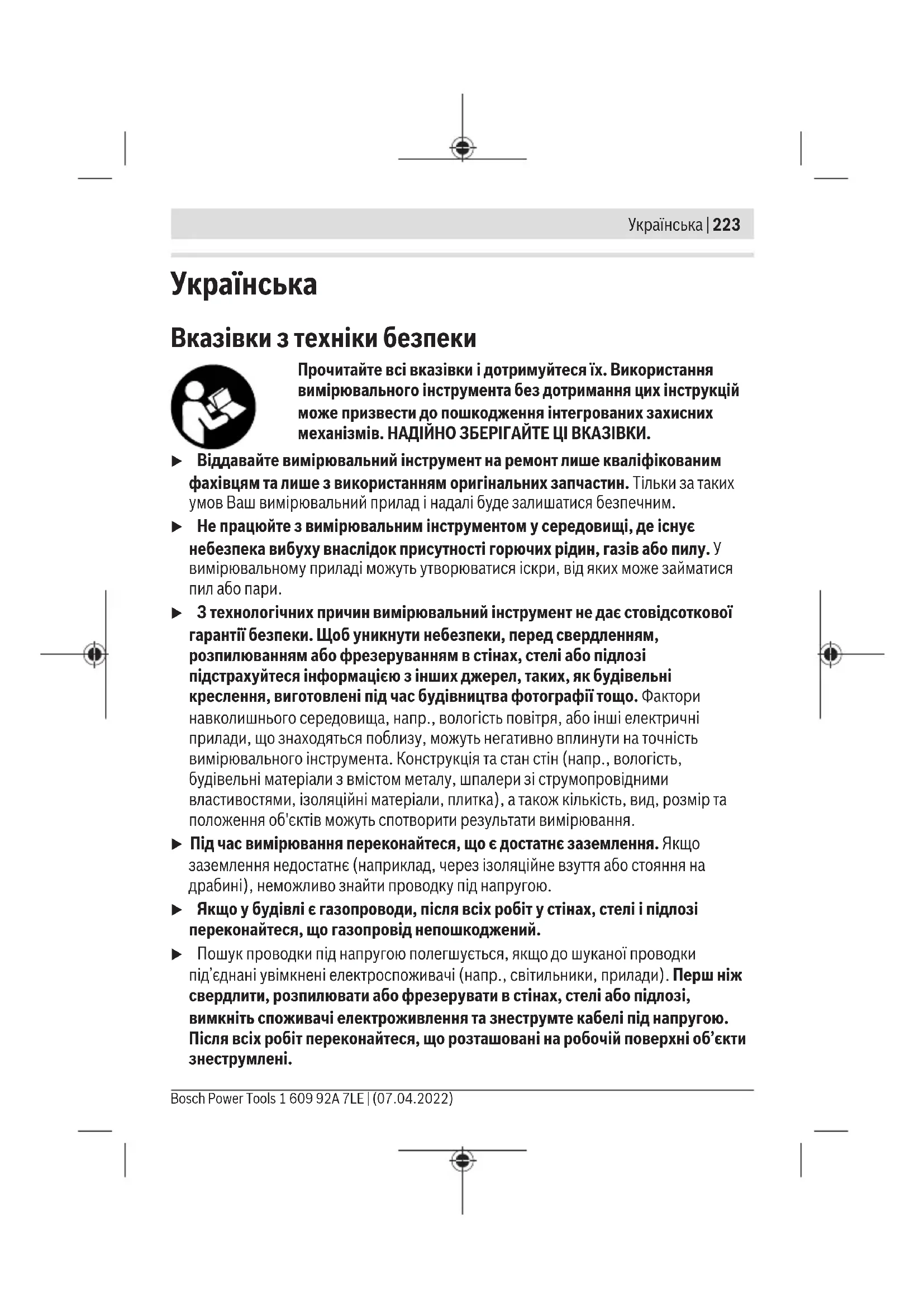 Вказівки з техніки безпеки Прочитайте всі вказівки і дотримуйтеся їх. Використання вимірювального інструмента без дотримання цих інструкцій може призвести до пошкодження інтегрованих захисних механізмів. НАДІЙНО ЗБЕРІГАЙТЕ ЦІ ВКАЗІВКИ. u Віддавайте вимірювальний інструмент на ремонт лише кваліфікованим фахівцям та лише з використанням оригінальних запчастин. Тільки за таких умов Ваш вимірювальний прилад і надалі буде залишатися безпечним. u Не працюйте з вимірювальним інструментом у середовищі, де існує небезпека вибуху внаслідок присутності горючих рідин, газів або пилу. У вимірювальному приладі можуть утворюватися іскри, від яких може займатися пил або пари. u З технологічних причин вимірювальний інструмент не дає стовідсоткової гарантії безпеки. Щоб уникнути небезпеки, перед свердленням, розпилюванням або фрезеруванням в стінах, стелі або підлозі підстрахуйтеся інформацією з інших джерел, таких, як будівельні креслення, виготовлені під час будівництва фотографії тощо. Фактори навколишнього середовища, напр., вологість повітря, або інші електричні прилади, що знаходяться поблизу, можуть негативно вплинути на точність вимірювального інструмента. Конструкція та стан стін (напр., вологість, будівельні матеріали з вмістом металу, шпалери зі струмопровідними властивостями, ізоляційні матеріали, плитка), а також кількість, вид, розмір та положення об'єктів можуть спотворити результати вимірювання. u Під час вимірювання переконайтеся, що є достатнє заземлення. Якщо заземлення недостатнє (наприклад, через ізоляційне взуття або стояння на драбині), неможливо знайти проводку під напругою. u Якщо у будівлі є газопроводи, після всіх робіт у стінах, стелі і підлозі переконайтеся, що газопровід непошкоджений. u Пошук проводки під напругою полегшується, якщо до шуканої проводки під’єднані увімкнені електроспоживачі (напр., світильники, прилади). Перш ніж свердлити, розпилювати або фрезерувати в стінах, стелі або підлозі, вимкніть споживачі електроживлення та знеструмте кабелі під напругою. Після всіх робіт переконайтеся, що розташовані на робочій поверхні об’єкти знеструмлені. Bosch Power Tools 1 609 92A 7LE | (07.04.2022)224 | Українська u У разі кріплення об’єктів до гіпсокартонних стін переконайтеся у достатній тримкості стіни або кріпильних матеріалів, особливо у разі кріплення до каркасної конструкції. Опис продукту і послуг Будь ласка, дотримуйтеся ілюстрацій на початку інструкції з експлуатації. Призначення приладу Вимірювальний інструмент призначений для пошуку металів (чорних та кольорових металів, наприклад, арматурного заліза), дерев’яних балок та кабелів під напругою у стінах, стелі та підлозі. Вимірювальний прилад придатний для робіт всередині приміщень та надворі. Зображені компоненти Нумерація зображених компонентів посилається на зображення вимірювального приладу на сторінці з малюнком. (1) Світлове кільце (2) Отвір для маркування (3)