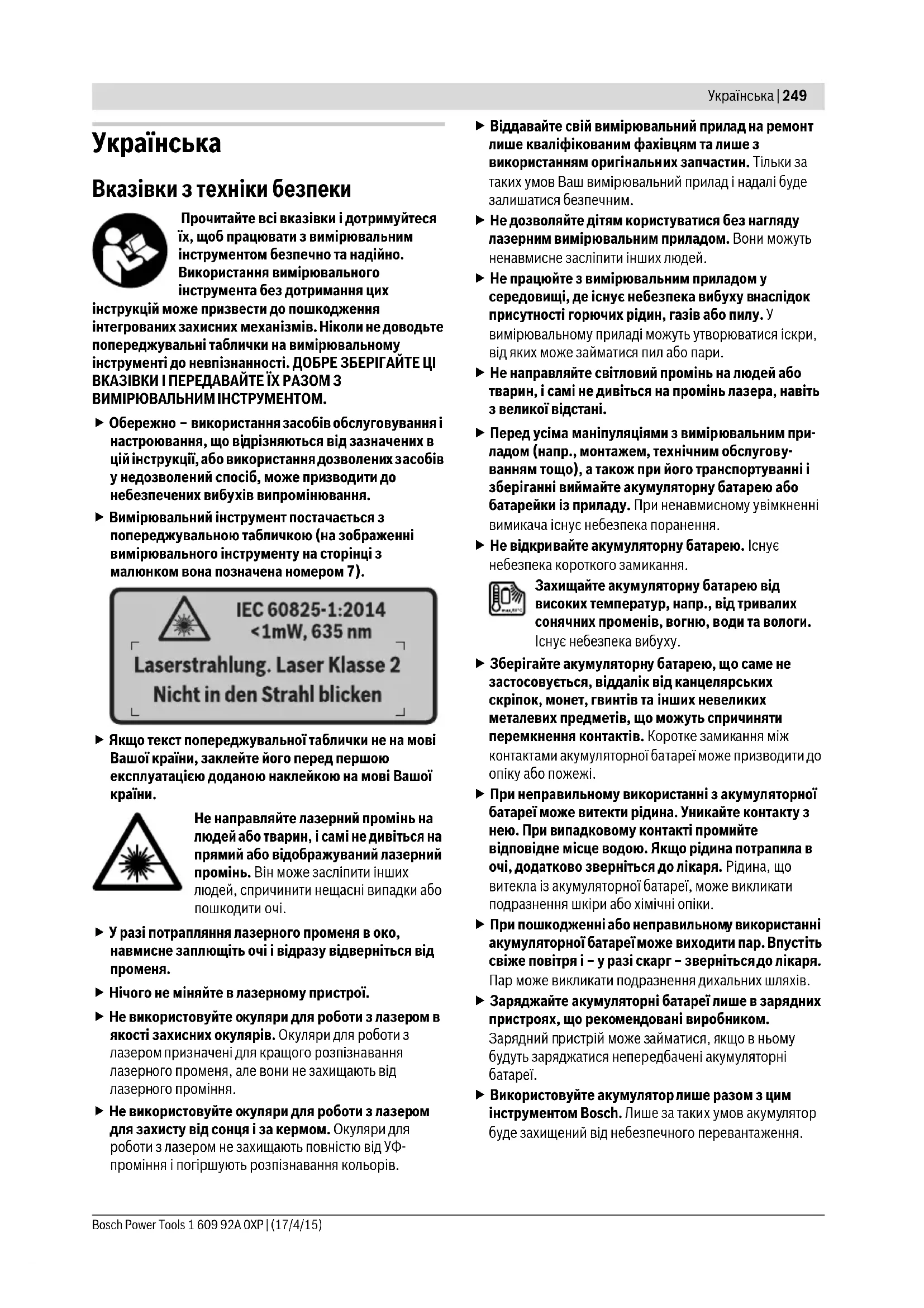 Вказівки з техніки безпеки Прочитайте всі вказівки і дотримуйтеся їх, щоб працювати з вимірювальним інструментом безпечно та надійно. Використання вимірювального інструмента без дотримання цих інструкцій може призвести до пошкодження інтегрованих захисних механ ізмів. Ніколи не доводьте попереджувальні таблички на вимірювальному інструменті до невпізнанності. ДОБРЕ ЗБЕРІГАЙТЕ ЦІ ВКАЗІВКИ І ПЕРЕДАВАЙТЕ ЇХ РАЗОМ З ВИМІРЮВАЛЬНИМ ІНСТРУМЕНТОМ. Обережно – використання засобів обслуговування і настроювання, що ві дрізняються від зазначених в цій інструкції, або використання дозволених з асобів у недозволений спосіб, може призводити до небезпечених вибухів випромінювання. Вимірювальний інструмент постачається з попереджувальною табличкою (на зображенні