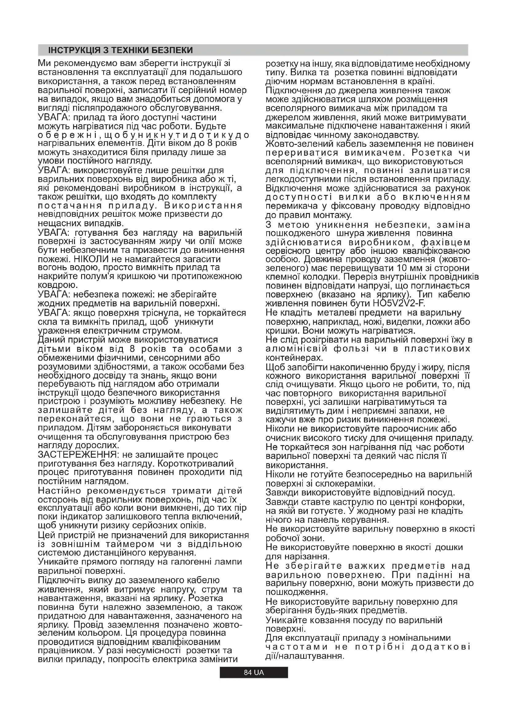Не використовуйте варильну поверхню для зберігання будь-яких предметів. Для експлуатації приладу з номінальними ч а с т о т а м и н е п о т р і б н і д о д а т к о в і дії/налаштування. Ніколи не готуйте безпосередньо на варильній поверхні зі склокераміки. Завжди використовуйте відповідний посуд. Не зберігайте важких пр едметів н а д варильною поверхнею. При падінні на варильну поверхню, вони можуть призвести до пошкодження. З метою уникнення небезпеки, заміна пошкодженого шнура живлення повинна здійснюватися виробником, фахівцем сервісного центру або іншою кваліфікованою особою. Довжина проводу заземлення (жовто- зеленого) має перевищувати 10 мм зі сторони клемної колодки. Переріз внутрішніх провідників повинен відповідати напрузі, що поглинається поверхнею (вказано на ярлику). Тип кабелю живлення повинен бути HO5V2V2-F. Жовто-зелений кабель заземлення не повинен перериватися вимикачем. Розетк а чи всеполярний вимикач, що використовуються для підключення, повинні залишатися легкодоступними після встановлення приладу. Не торкайтеся зон нагрівання під час роботи варильної поверхні та деякий час після її використання. Підключення до джерела живлення також може здійснюватися шляхом розміщення всеполярного вимикача між приладом та джерелом живлення, який може витримувати максимальне підключене навантаження і який відповідає чинному законодавству. Відключення може здійснюватися за рахунок д о с т у п н о с т і в и л к и а б о в к л юч е н н я м перемикача у фіксовану проводку відповідно до правил монтажу. Не кладіть металеві предмети на варильну поверхню, наприклад, ножі, виделки, ложки або кришки. Вони можуть нагріватися. Не слід розігрівати на варильній поверхні їжу в алюмінієвій фользі чи в пластикових контейнерах. Щоб запобігти накопиченню бруду і жиру, після кожного використання варильної поверхні її слід очищувати. Якщо цього не робити, то, під час повторного використання варильної поверхні, усі залишки нагріватимуться та виділятимуть дим і неприємні запахи, не кажучи вже про ризик виникнення пожежі. Ніколи не використовуйте пароочисник або очисник високого тиску для очищення приладу. розетку на іншу, яка відповідатиме необхідному типу. Вилка та розетка повинні відповідати діючим нормам встановлення в країні.Залиште принаймні 55 мм між варильною поверхнею та задньою стіною, а також щонайменше 150 мм між варильною поверхнею та вертикальним елементом меблів або бічною стіною. Я к щ о н а д в а р и л ь н о ю поверхнею встановлені інші елементи меблів, відстань до них повинна ста н о в и т и щонайменше 700 мм. Підчасвстановлення витяжкинадварильною поверхнеюскористайтеся рекомендаціямизі встановленнявитяжки, алев будь-якомуразівідстаньміж варильноюповерхнеюта витяжкоюповинна становитищонайменше 700