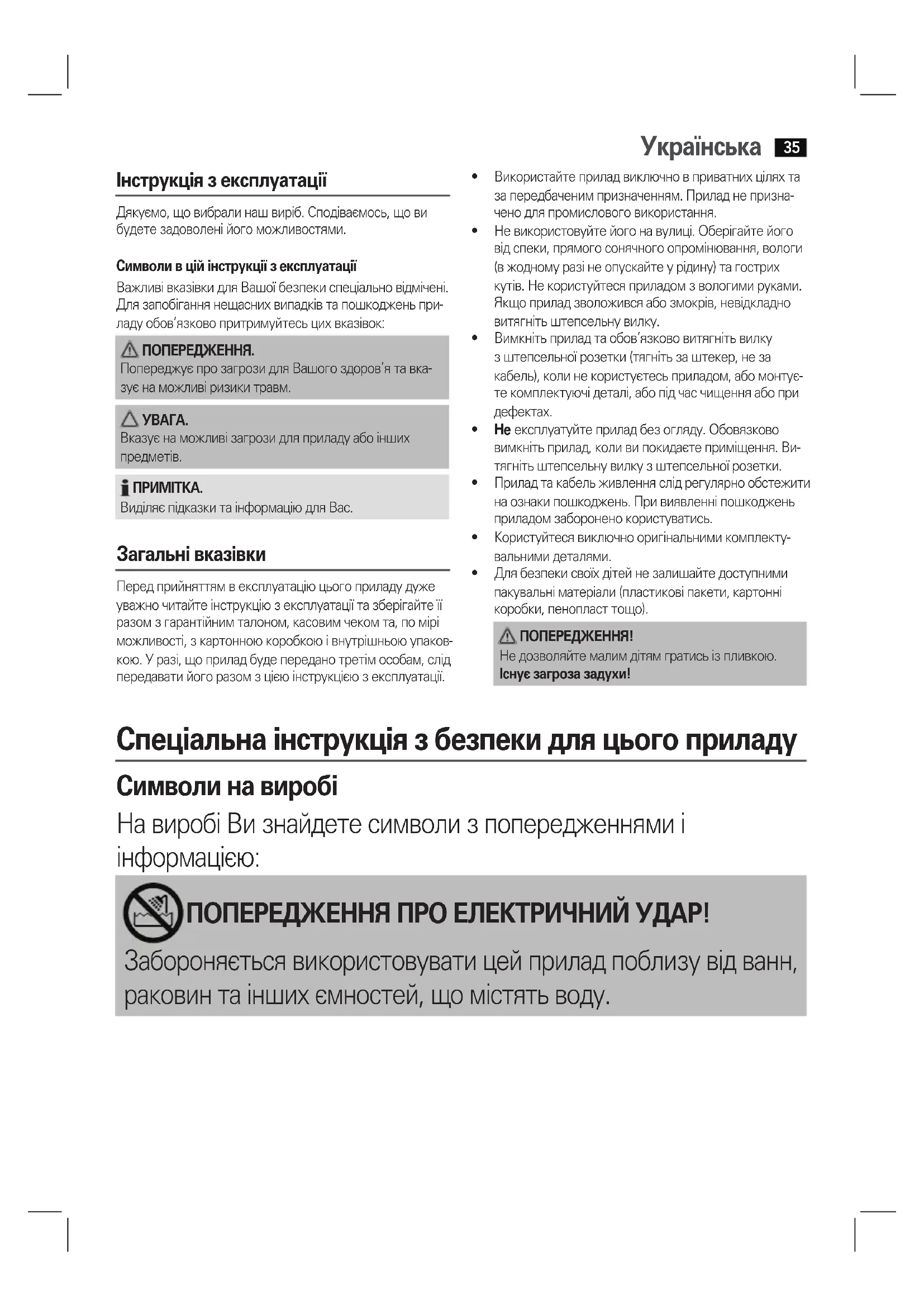 Інструкція з експлуатації Дякуємо, що вибрали наш виріб. Сподіваємось, що ви будете задоволені його можливостями.Символи в цій інструкції з експлуатаціїВажливі вказівки для Вашої безпеки спеціально відмічені. Для запобігання нещасних випадків та пошкоджень при-ладу обов’язково притримуйтесь цих вказівок: ПОПЕРЕДЖЕННЯ. Попереджує про загрози для Вашого здоров’я та вка-зує на можливі ризики травм. УВАГА.Вказує на можливі загрози для приладу або інших предметів. ПРИМІТКА.Виділяє підказки та інформацію для Вас. Загальні вказівки Перед прийняттям в експлуатацію цього приладу дуже уважно читайте інструкцію з експлуатації та зберігайте її разом з гарантійним талоном, касовим чеком та, по мірі можливості, з картонною коробкою і внутрішньою упаков-кою. У разі, що прилад буде передано третім особам, слід передавати його разом з цією інструкцією з експлуатації.• Використайтеприладвиключновприватнихціляхтаза передбаченим призначенням. Прилад не призна-чено для промислового використання. • Невикористовуйтейогонавулиці.Оберігайтейоговід спеки, прямого сонячного опромінювання, вологи (в жодному разі не опускайте у рідину) та гострих кутів.Некористуйтесяприладомзвологимируками.Якщо прилад зволожився або змокрів, невідкладно витягніть штепсельну вилку.• Вимкнітьприладтаобов’язкововитягнітьвилкуз штепсельної розетки (тягніть за штекер, не за кабель), коли не користуєтесь приладом, або монтує-те комплектуючі деталі, або під час чищення або при дефектах.• Не експлуатуйтеприладбезогляду.Обовязкововимкніть прилад, коли ви покидаєте приміщення. Ви-тягніть штепсельну вилку з штепсельної розетки.• Приладтакабельживленняслідрегулярнообстежитина ознаки пошкоджень. При виявленні пошкоджень приладом заборонено користуватись.• Користуйтесявиключнооригінальнимикомплекту-вальними деталями.• Длябезпекисвоїхдітейнезалишайтедоступнимипакувальні матеріали (пластикові пакети, картонні коробки, пенопласт тощо). ПОПЕРЕДЖЕННЯ!Недозволяйтемалимдітямгратисьізпливкою.Існує загроза задухи! Спеціальна інструкція з безпеки для цього приладу Символи на виробі НавиробіВизнайдетесимволизпопередженнямиі інформацією: ПОПЕРЕДЖЕННЯ ПРО ЕЛЕКТРИЧНИЙ УДАР! Забороняється використовувати цей прилад поблизу від ванн, раковин та інших ємностей, що містять воду.Українська