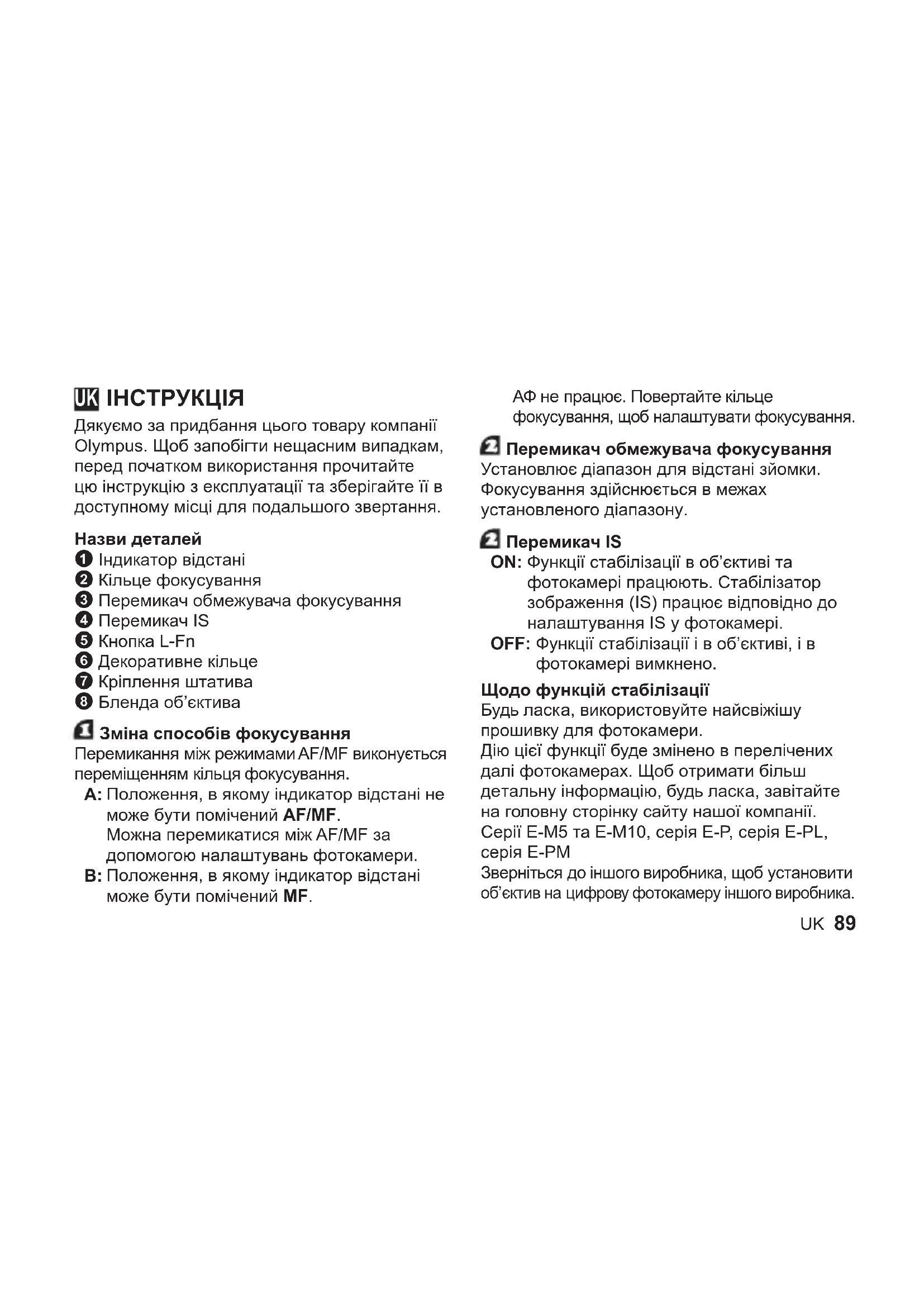 Дякуємо за придбання цього товару компанії Olympus. Щоб запобігти нещасним випадкам, перед початком використання прочитайте цю інструкцію з експлуатації та зберігайте її в доступному місці для подальшого звертання. Назви деталей 1 Індикатор відстані 2 Кільце фокусування 3 Перемикач обмежувача фокусування 4 Перемикач IS 5 Кнопка L-Fn 6 Декоративне кільце 7 Кріплення штатива 8 Бленда об’єктива Зміна способів фокусування Перемикання між режимами AF/MF виконується переміщенням кільця фокусування.