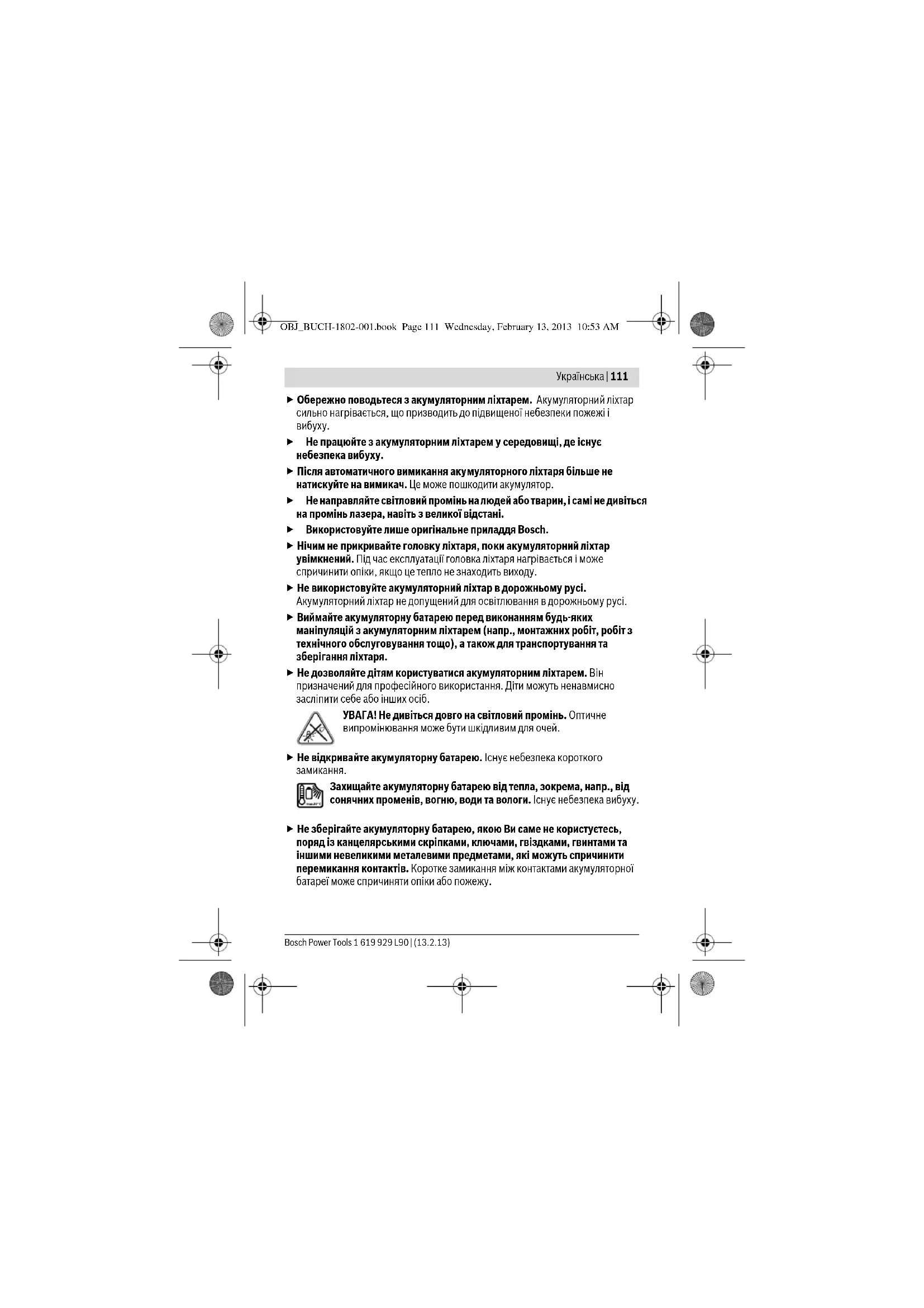 Вказівки з техніки безпеки Вказівки з техніки безпеки для акумуляторних ліхтарів Прочитайте всі застереження і вказівки. Недотримання застережень і вказівок може призвести до ураження електричним струмом, пожежі та/або серйозних травм. Будь ласка, прочитайте і дотримуйтеся всіх вказівок з техніки безпеки і інструкцій, доданих до акумуляторної батареї або до електроінструменту, з яким поставлена акумуляторна батарея. OBJ_BUCH-1802-001.book Page 110 Wednesday, February 13, 2013 10:53 AMУкраїнська | 111 Bosch Power Tools 1 619 929 L90 | (13.2.13) Обережно поводьтеся з акумуляторним ліхтарем. Акумуляторний ліхтар сильно нагрівається, що призводить до підвищеної небезпеки пожежі і