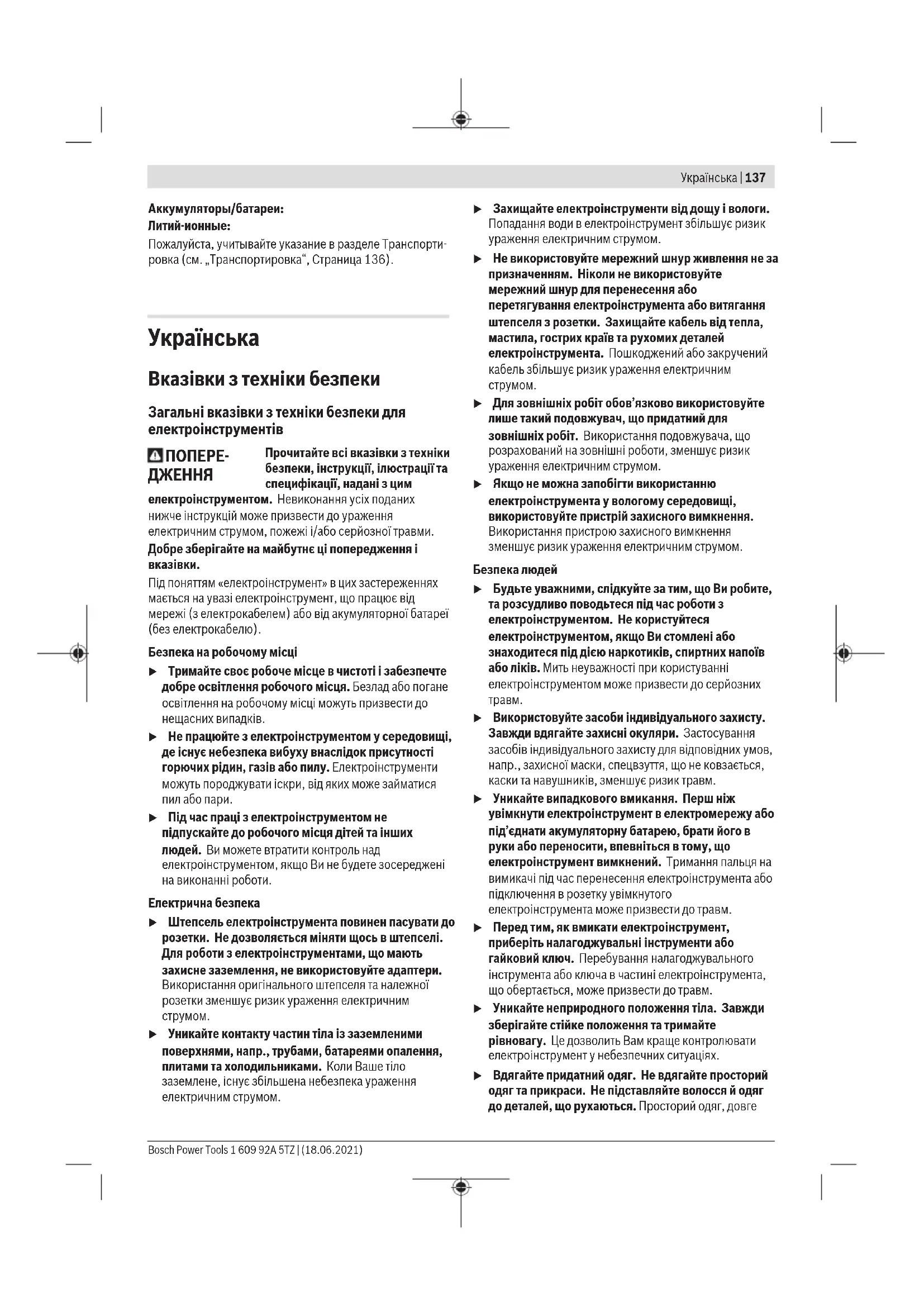 u Використовуйте засоби індивідуального захисту. Завжди вдягайте захисні окуляри. Застосування засобів індивідуального захисту для відповідних умов, напр.,захисної маски, спецвзуття, що не ковзається, каски та навушників, зменшує ризик травм. u Уникайте випадкового вмикання. Перш ніж увімкнути електроінструмент в електромережу або під’єднати акумуляторну батарею, брати його в руки або переносити, впевніться в тому, що електроінструмент вимкнений. Тримання пальця на вимикачі під час перенесення електроінструмента або підключення в розетку увімкнутого електроінструмента може призвести до травм. u Перед тим, як вмикати електроінструмент, приберіть налагоджувальні інструменти або гайковий ключ. Перебування налагоджувального інструмента або ключа в частині електроінструмента, що обертається, може призвести до травм. u Уникайте неприродного положення тіла. Завжди зберігайте стійке положення та тримайте рівновагу. Це дозволить Вам краще контролювати електроінструмент у небезпечних ситуаціях. u Вдягайте придатний одяг. Не вдягайте просторий одяг та прикраси. Не підставляйте волосся й одяг до деталей, що рухаються. Просторий одяг, довге Bosch Power Tools 1 609 92A 5TZ | (18.06.2021)138 | Українська волосся та прикраси можуть потрапити в деталі, що