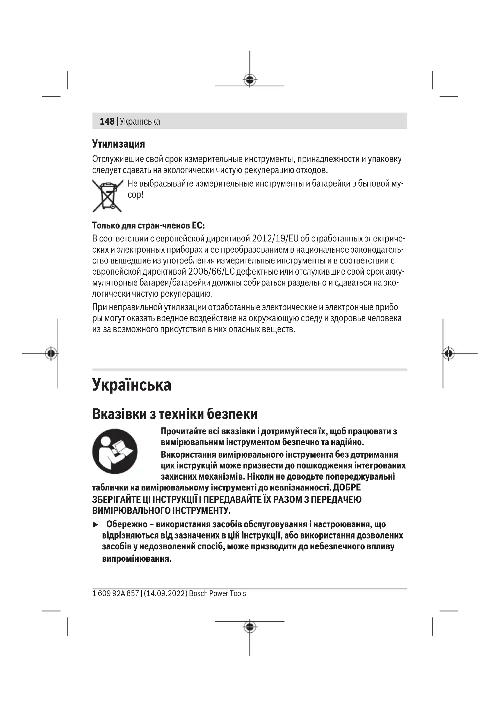 Вимірювальні прилади, приладдя і упаковку треба здавати на екологічно чисту повторну переробку. Не викидайте вимірювальні інструменти і батарейки в побутове сміття! Лише для країнЄС: Відповідно до Європейської Директиви 2012/19/EU щодо відходів електричного та електронного обладнання та її перетворення в національне законодавство вимірювальні інструменти, які більше не придатні до використання, а також відповідно до Європейської Директиви 2006/66/EC несправні або відпрацьовані акумуляторні батареї/батарейки повинні здаватися окремо і утилізуватися екологічно чистим способом. При неправильній утилізації відпрацьовані електричні та електронні прилади можуть мати шкідливий вплив на навколишнє середовище та здоров’я людини через можливу наявність небезпечних речовин. 1 609 92A 857 | (14.09.2022) Bosch Power ToolsҚазақ | 157