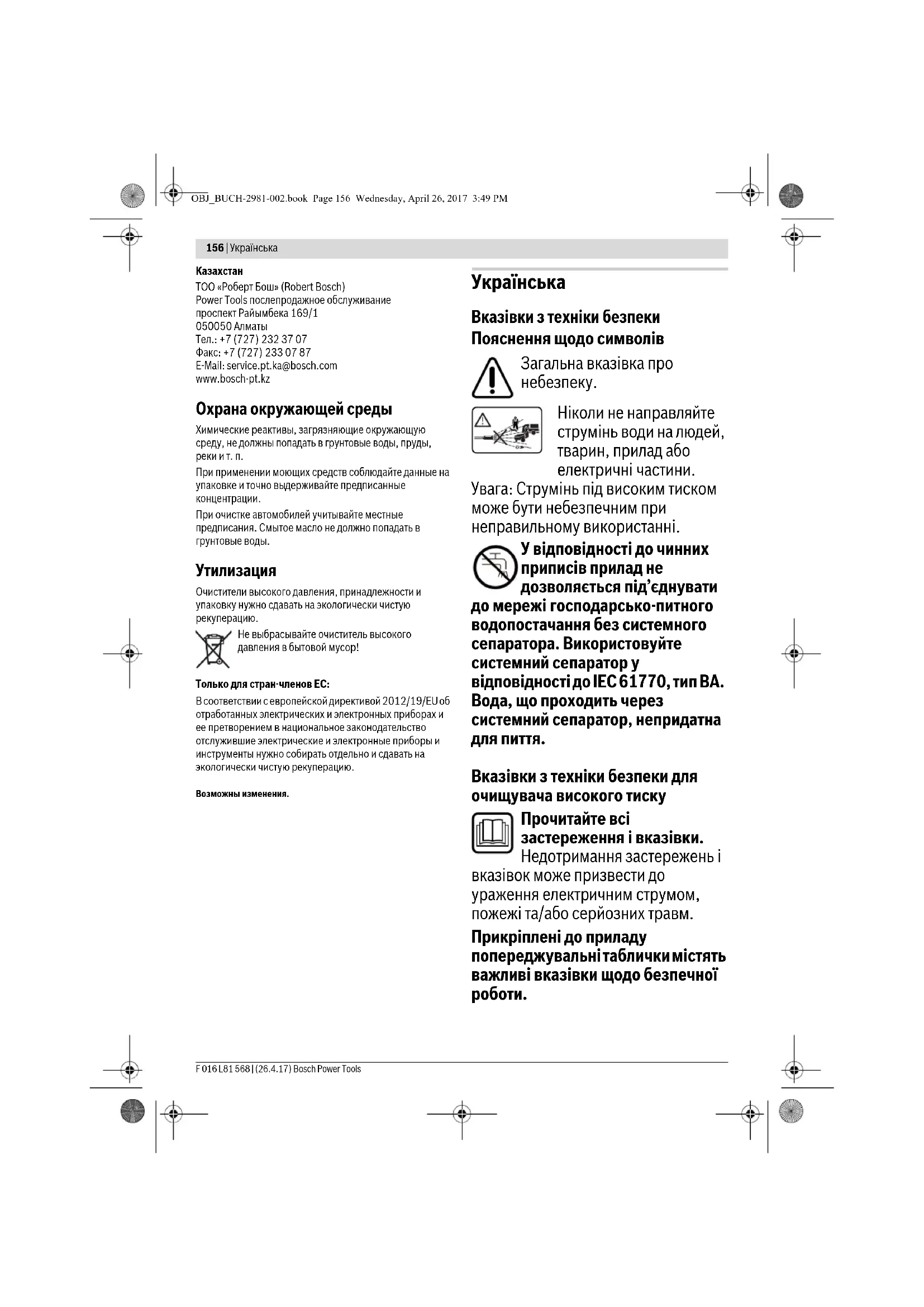 Миючий засі б не засмоктується Мийний засіб занадто густий Розбавте водою Осад або перегин у соплі для миючого засобу Промийте чистою водою і усуньте перегин. Якщо проблема не зникла, зверніться за порадою до сервісного центра Bosch. Симптоми Можлива причина Що робити OBJ_BUCH-2981-002.book Page 164 Wednesday, April 26, 2017 3:49 PMҚaзақша | 165 Bosch Power Tools F 016 L81 568 | (26.4.17) Сервіс та надання консультацій щодо використання продукції www.bosch-do-it.com При всіх додаткових запитаннях та замовленні запчастин, будь ласка, зазначайте 10-значний номер для замовлення, що стоїть на заводській табличці приладу. Гарантійне обслуговування і ремонт електроінструменту здійснюються відповідно до вимог і норм виготовлювача на території всіх країн лише у фірмових або авторизованих сервісних центрах фірми «Роберт Бош». ПОПЕРЕДЖЕННЯ! Використання контрафактної продукції небезпечне в експлуатації і може мати негативні наслідки для здоров’я. Виготовлення і розповсюдження контра- фактної продукції пересліду ється за Законом в адміністра- тивному і кримінальному порядку.