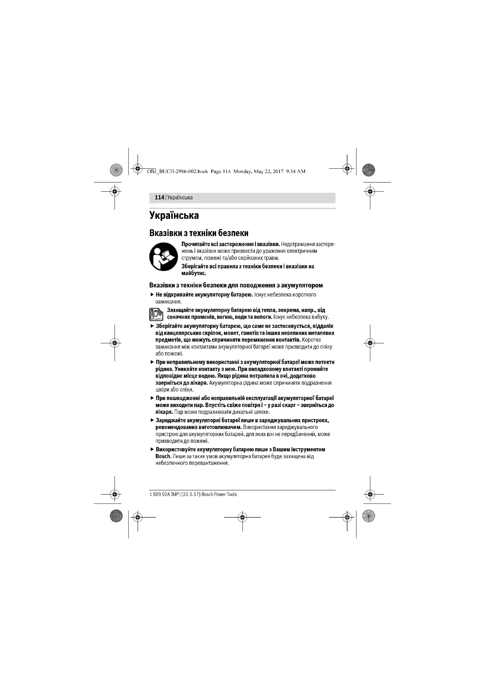 Вказівки з техніки безпеки для поводження з акумулятором Не відкривайте акумуляторну батарею. Існує небезпека короткого