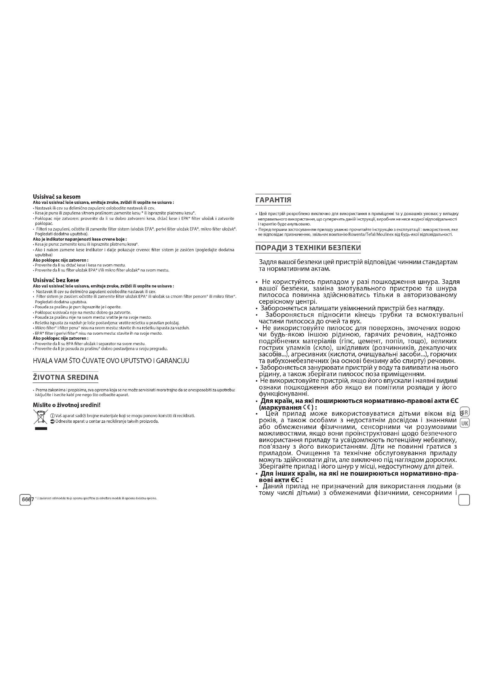ВАЖЛИВО! Якщо ви помітили, що пилосос почав гірше працювати, вимкніть його, натиснувши на кнопку увімкнення/вимкнення, перш ніж проводити будь-який огляд.* В зависимости от модели: специфическое оборудование для приборов некоторых моделей или аксессуары, которые можно при-обрести дополнительно. UK70 71• Мішок заповнено: замініть мішок або спорожніть тканинний мішок*.• Якщо після зміни мішка індикатор залишається червоним : система фільтрації заповнена (дивіться додат- кові інструкції)Кришка не закривається :• Переконайтесь у наявності тримача для мішка, мішка або у правильності їх установлення.• Перевірте наявність касетного фільтра EPA* або касетного мікрофільтра* і/або їхнього правильного встановлення Пилосос без мішкаЯкщо пилосос почав гірше втягувати бруд, видає сторонні звуки чи свист або не втягує пил взагалі :• Аксесуар або шланг частково заблоковані: прочистьте аксесуар або шланг.• Система фільтрації заповнена: очистьте або замініть касетний фільтр EPA*, чорний поролоновий фільтр* або мікрофільтр*. Дивіться додаткові інструкції.• Пилозбірник заповнено: спорожніть і помийте його.• Неправильно встановлено кришку пилососа: закрийте кришку правильно.• Неправильно встановлено пилозбірник: установіть його правильно.• Неправильно встановлено решітку для виходу повітря: установіть решітку для виходу повітря правильно.• Мікрофільтр* і поролоновий фільтр* відсутні: установіть їх у решітку для виходу повітря.• ЕРА-фільтр* і фільтр, що миється* відсутні: установіть їх у пилосос.Кришка не закривається :• Переконайтесь, що касетний ЕРА-фільтр* і сепаратор* правильно встановлено.• Переконайтеся, що пилозбірник* правильно встановлено у відділенні для пилозбірника*. ПРОСИМО ЗБЕРІГАТИ ЦЮ ІНСТРУКЦІЮ ТА ГАРАНТІЙНИЙ ТАЛОН ЗАХИСТ ДОВКІЛЛЯ
