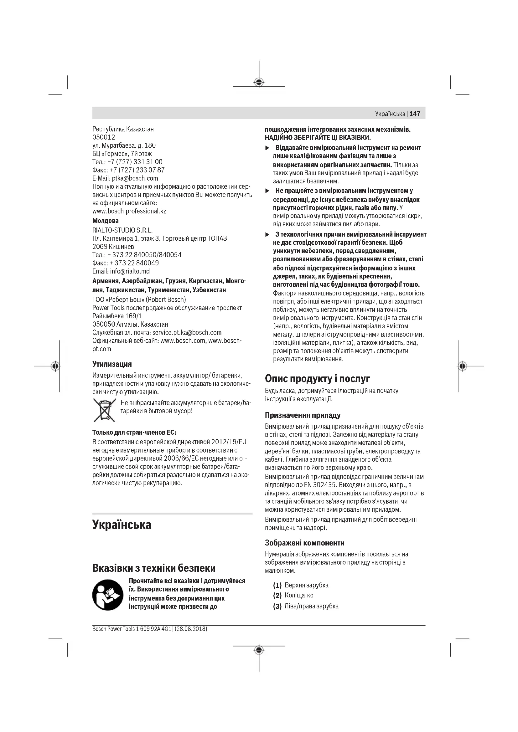 Вказівки з техніки безпеки Прочитайте всі вказівки і дотримуйтеся їх. Використання вимірювального інструмента без дотримання цих інструкцій може призвести до пошкодження інтегрованих захисних механізмів. НАДІЙНО ЗБЕРІГАЙТЕ ЦІ ВКАЗІВКИ. u Віддавайте вимірювальний інструмент на ремонт лише кваліфікованим фахівцям та лише з використанням оригінальних запчастин. Тільки за таких умов Ваш вимірювальний прилад і надалі буде залишатися безпечним. u Не працюйте з вимірювальним інструментом у середовищі, де існує небезпека вибуху внаслідок присутності горючих рідин, газів або пилу. У вимірювальному приладі можуть утворюватися іскри, від яких може займатися пил або пари. u З технологічних причин вимірювальний інструмент не дає стовідсоткової гарантії безпеки. Щоб уникнути небезпеки, перед свердленням, розпилюванням або фрезеруванням в стінах, стелі або підлозі підстрахуйтеся інформацією з інших джерел, таких, як будівельні креслення, виготовлені під час будівництва фотографії тощо. Фактори навколишнього середовища, напр., вологість повітря, або інші електричні прилади, що знаходяться поблизу, можуть негативно вплинути на точність вимірювального інструмента. Конструкція та стан стін (напр., вологість, будівельні матеріали з вмістом металу, шпалери зі струмопровідними властивостями, ізоляційні матеріали, плитка), а також кількість, вид, розмір та положення об'єктів можуть спотворити результати вимірювання. Опис продукту і послуг Будь ласка, дотримуйтеся ілюстрацій на початку інструкції з експлуатації. Призначення приладу Вимірювальний прилад призначений для пошуку об’єктів в стінах, стелі та підлозі. Залежно від матеріалу та стану поверхні прилад може знаходити металеві об’єкти, дерев’яні балки, пластмасові труби, електропроводку та кабелі. Глибина залягання знайденого об’єкта визначається по його верхньому краю. Вимірювальний прилад відповідає граничним величинам відповідно до EN302435. Виходячи з цього, напр., в лікарнях, атомних електростанціях та поблизу аеропортів та станцій мобільного зв'язку потрібно з'ясувати, чи можна користуватися вимірювальним приладом. Вимірювальний прилад придатний для робіт всередині приміщень та надворі. Зображені компоненти Нумерація зображених компонентів посилається на зображення вимірювального приладу на сторінці з