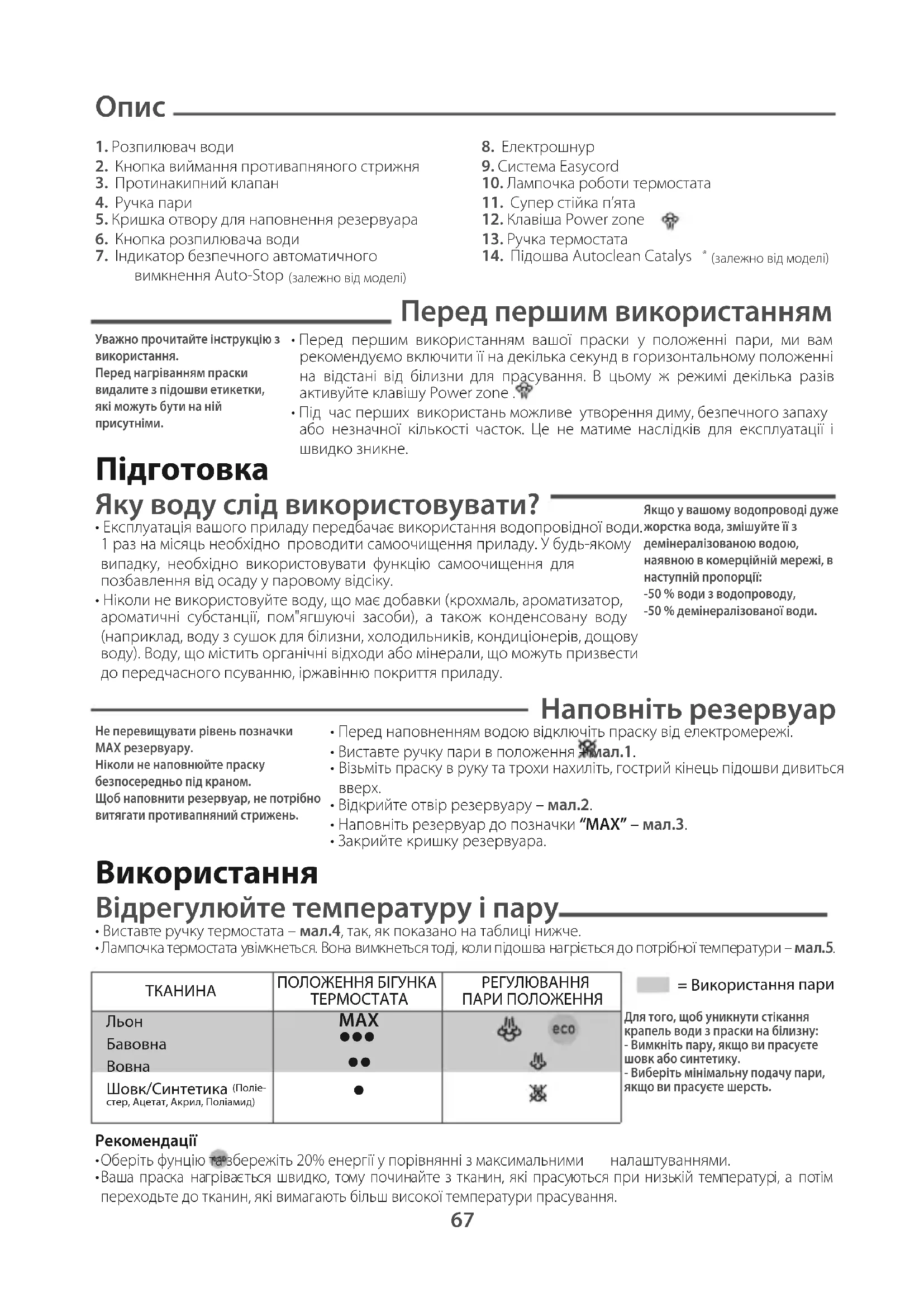 1. Розпилювач води2. Кнопка виймання противапняного стрижня3. Протинакипний клапан4. Ручка пари5. Кришка отвору для наповнення резервуара6. Кнопка розпилювача води7. Індикатор безпечного автоматичноговимкнення Auto-Stop(залежно вiд моделi)8. Електрошнур9. Система Easycord10. Лампочка роботи термостата11. Супер стiйка п’ята12. Клавіша Power zone 13. Ручка термостата14. Пiдошва Autoclean Catalys (залежно вiд моделi) Перед першим використанням
