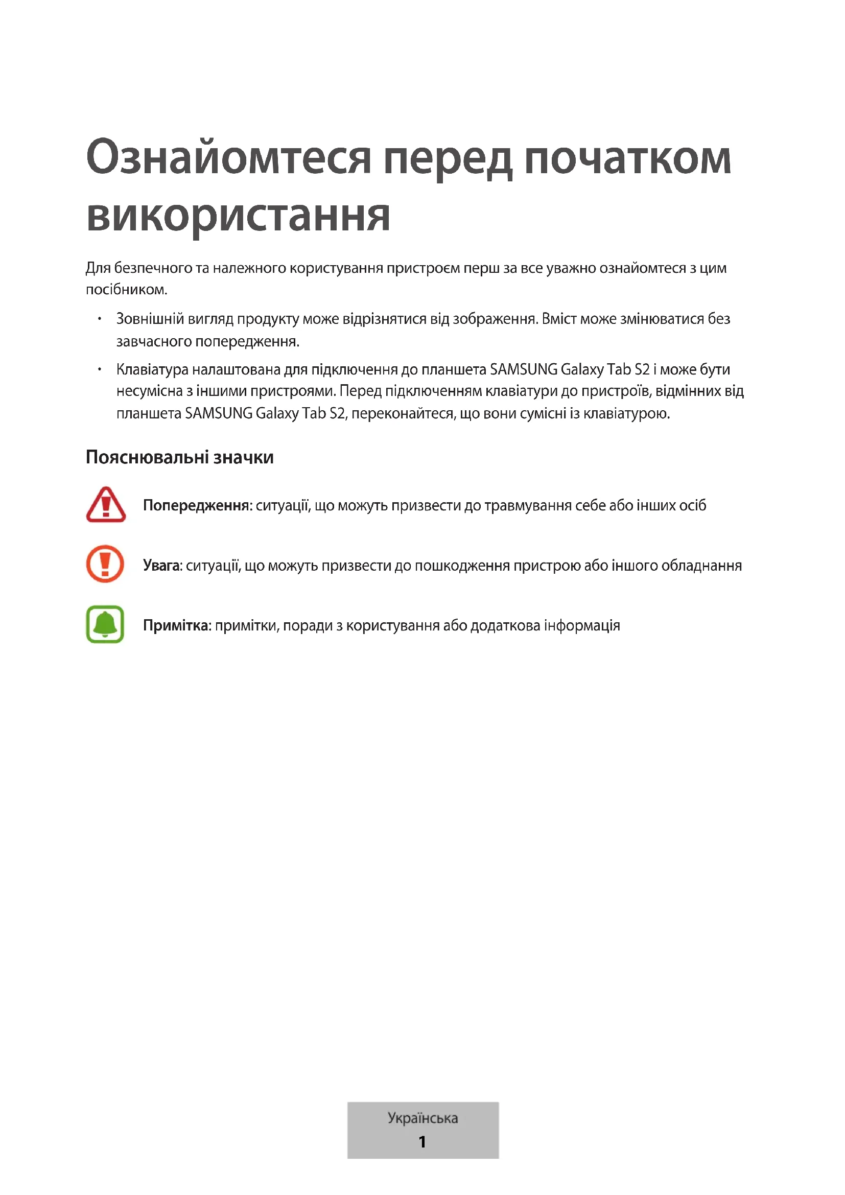 Клавіатура налаштована для підключення до планшета SAMSUNG Galaxy Tab S2 і може бути несумісна з іншими пристроями. Перед підключенням клавіатури до пристроїв, відмінних від планшета SAMSUNG Galaxy Tab S2, переконайтеся, що вони сумісні із клавіатурою. Пояснювальні значки Попередження: ситуації, що можуть призвести до травмування себе або інших осіб Увага: ситуації, що можуть призвести до пошкодження пристрою або іншого обладнання Примітка: примітки, поради з користування або додаткова інформація