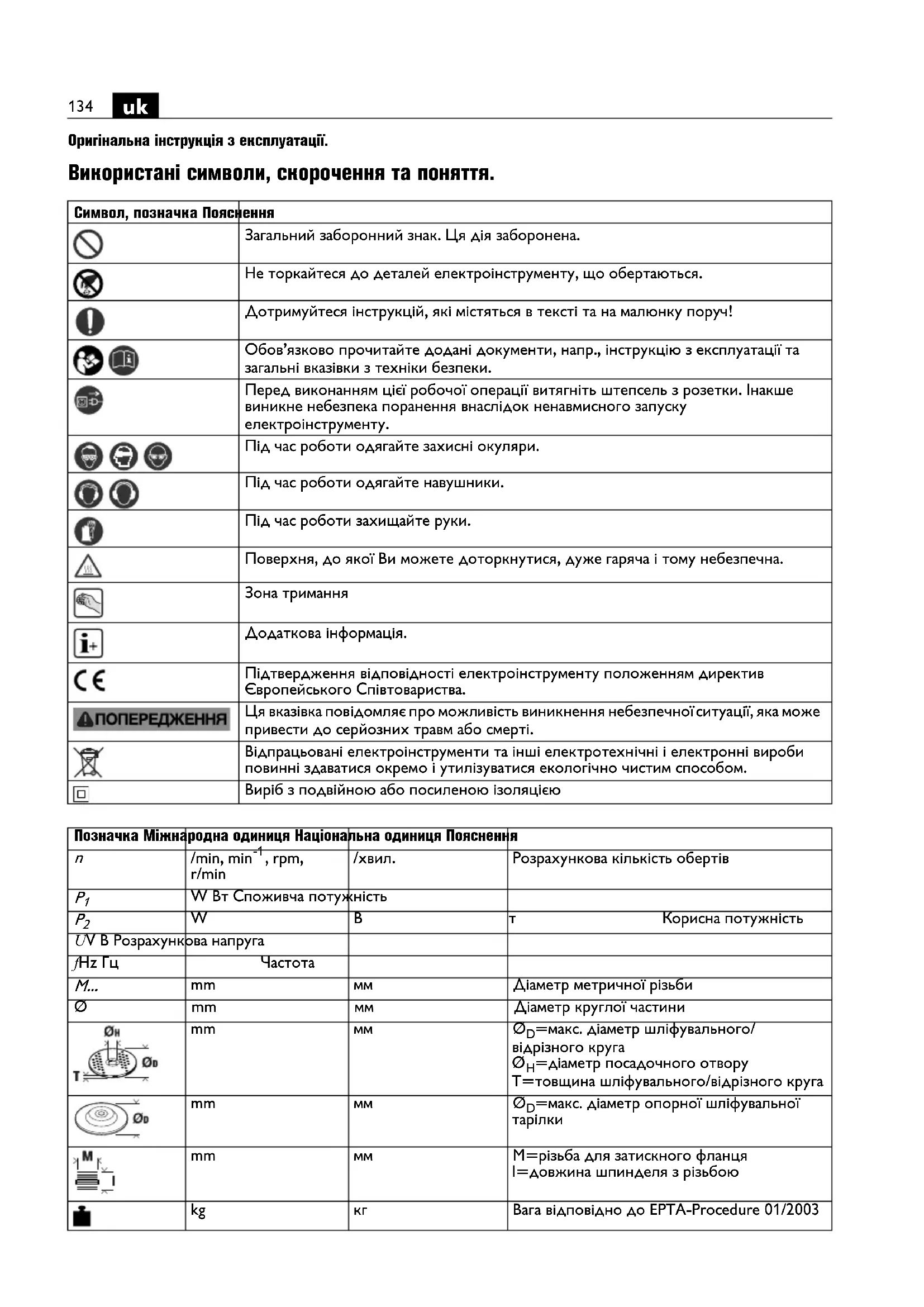 Оригінальна інструкція з експлуатації. Використані символи, скорочення та поняття. Символ, позначка Пояснення Загальний заборонний знак. Ця дія заборонена. Не торкайтеся до деталей електроінструменту, що обертаються. Дотримуйтеся інструкцій, які містяться в тексті та на малюнку поруч! Обов’язково прочитайте додані документи, напр., інструкцію з експлуатації та загальні вказівки з техніки безпеки. Перед виконанням цієї робочої операції витягніть штепсель з розетки. Інакше виникне небезпека поранення внаслідок ненавмисного запуску електроінструменту. Під час роботи одягайте захисні окуляри. Під час роботи одягайте навушники. Під час роботи захищайте руки. Поверхня, до якої Ви можете доторкнутися, дуже гаряча і тому небезпечна. Зона тримання Додаткова інформація. Підтвердження відповідності електроінструменту положенням директив Європейського Співтовариства. Ця вказівка повідомляє про можливість виникнення небезпечної ситуації, яка може привести до серйозних травм або смерті. Відпрацьовані електроінструменти та інші електротехнічні і електронні вироби повинні здаватися окремо і утилізуватися екологічно чистим способом. Виріб з подвійною або посиленою ізоляцією Позначка Міжнародна одиниця Національна одиниця Пояснення