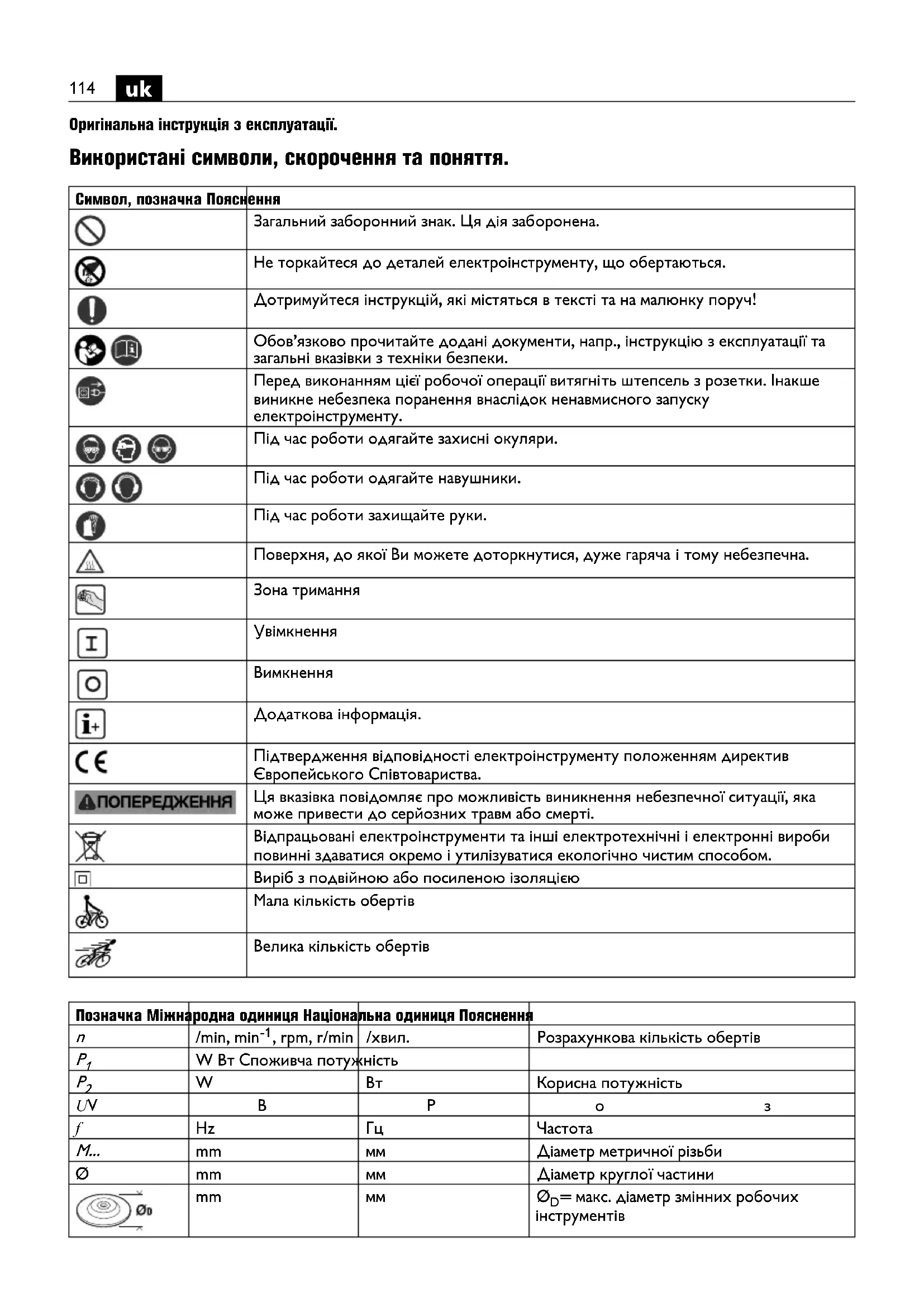 Додаткова інформація. Підтвердження відповідності електроінструменту положенням директив Європейського Співтовариства. Ця вказівка повідомля є про можливість виникнення небезпечної ситуації, яка може привести до серйозних травм або смерті. Відпрацьовані електроінструменти та інші електротехнічні і електронні вироби повинні здаватися окремо і утилізуватися екологічно чистим способом. Виріб з подвійною або посиленою ізоляцією Мала кількість обертів Велика кількість обертів Позначка Міжнародна одиниця Національна одиниця Пояснення