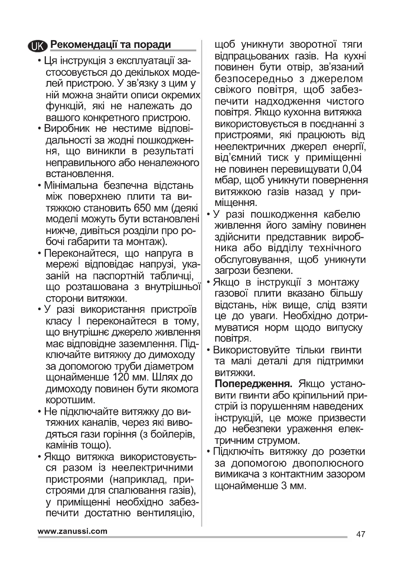- У разі використання пристроїв класу I переконайтеся в тому, що внутрішнє джерело живлення має відповідне заземлення. Під- ключайте витяжку до димоходу за допомогою труби діаметром щонайменше 120 мм. Шлях до димоходу повинен бути якомога