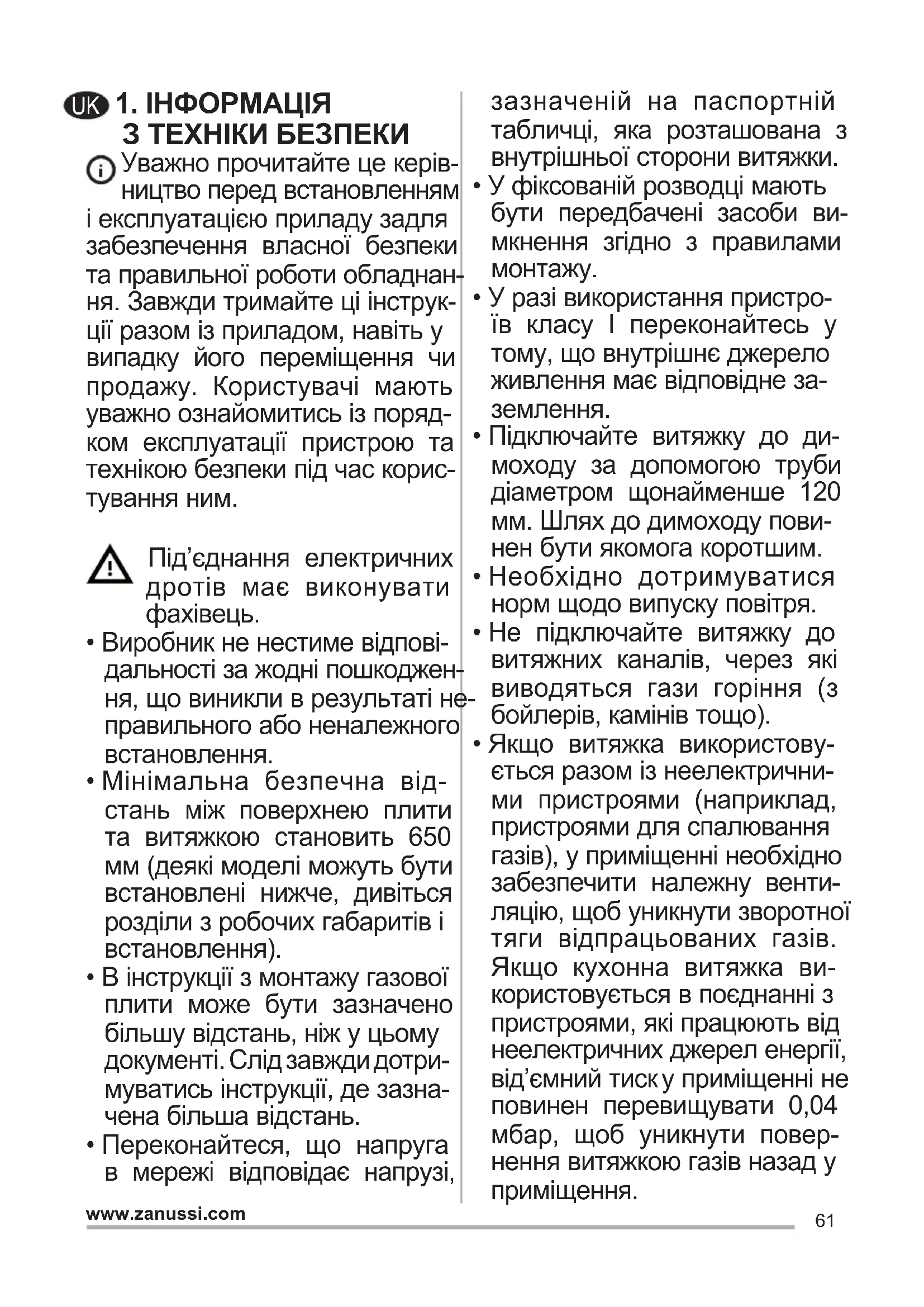 - Якщо витяжка використову- ється разом із неелектрични- ми пристроями (наприклад, пристроями для спалювання газів), у приміщенні необхідно забезпечити належну венти- ляцію, щоб уникнути зворотної тяги відпрацьованих газів. Якщо кухонна витяжка ви- користовується в поєднанні з пристроями, які працюють від неелектричних джерел енергії, від’ємний тиск у приміщенні не повинен перевищувати 0,04 мбар, щоб уникнути повер- нення витяжкою газів назад у приміщення. UK62 www.zanussi.com