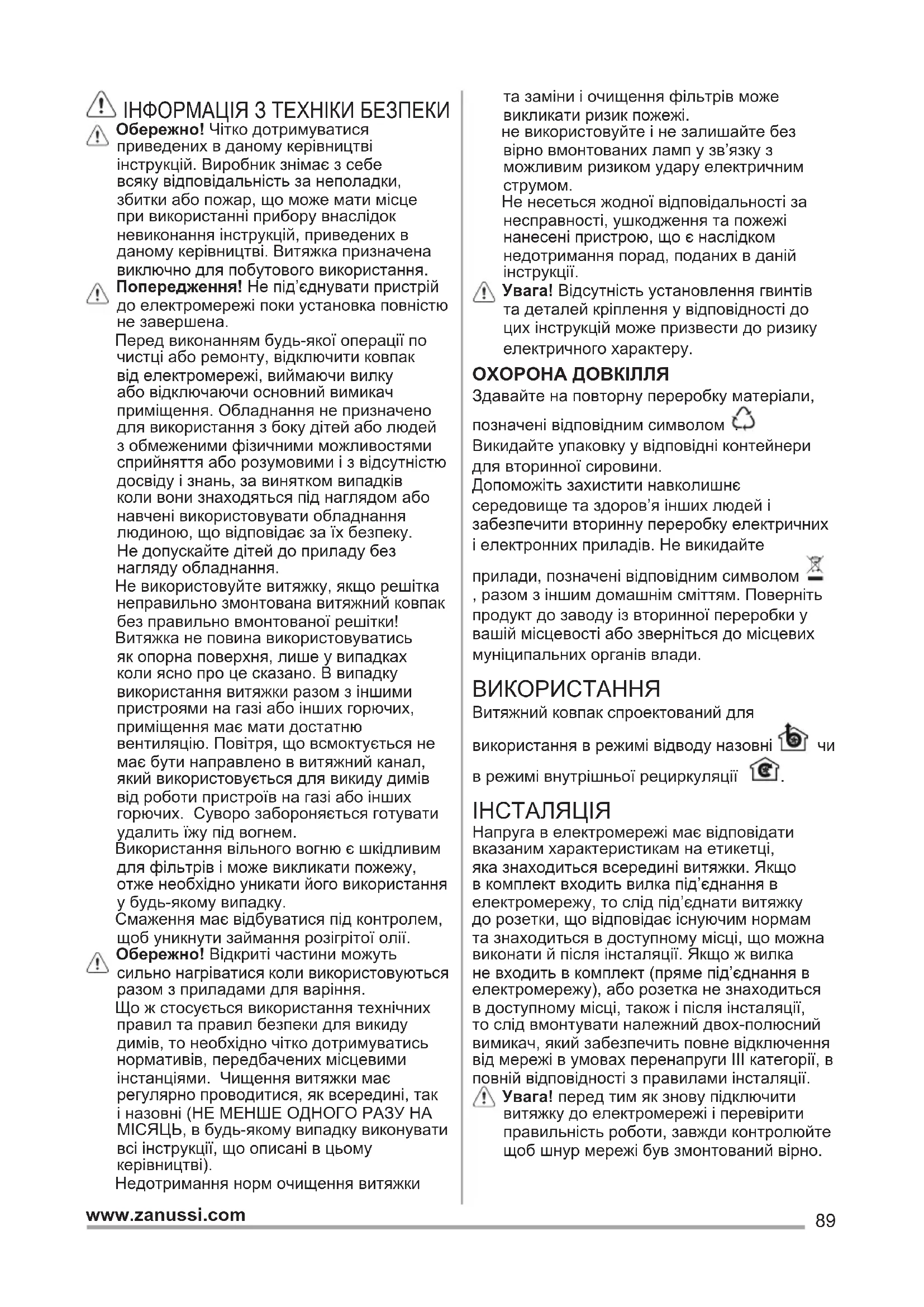 tõmbevõimsus (5). Kui auru kontsentratsioon köögis on eriti suur, kasutage kõige suuremat kiirust. Soovitame väljatõmbe sisse lülitada 5 minutit enne söögitegemise algust ning jätta see pärast söögivalmistamise lõppu veel umbes 15 minutiks tööle. VALGUSTUS Õhupuhasti on varustatud LED-valgustitega. LED-lambid tagavad optimaalse valguse kuni kümme korda pikema kestvusega võrreldes tavalampidega ning nende elektrienergia kokkuhoid on 90%. Ettevaatust! Ärge vaadake otse LED- valgusesse. Pirnide väljavahetamiseks pöörduge teeninduskeskuse poole.89 www.zanussi.com ІНФОРМАЦІЯ З ТЕХНІКИ БЕЗПЕКИ Обережно! Чітко дотримуватися приведених в даному керівництві інструкцій. Виробник знімає з себе всяку відповідальність за неполадки, збитки або пожар, що може мати місце при використанні прибору внаслідок невиконання інструкцій, приведених в даному керівництві. Витяжка призначена виключно для побутового використання. Попередження! Не під’єднувати пристрій до електромережі поки установка повністю не завершена. Перед виконанням будь-якої операції по чистці або ремонту, відключити ковпак від електромережі, виймаючи вилку або відключаючи основний вимикач приміщення. Обладнання не призначено для використання з боку дітей або людей з обмеженими фізичними можливостями сприйняття або розумовими і з відсутністю досвіду і знань, за винятком випадків коли вони знаходяться під наглядом або навчені використовувати обладнання людиною, що відповідає за їх безпеку. Не допускайте дітей до приладу без нагляду обладнання. Не використовуйте витяжку, якщо решітка неправильно змонтована витяжний ковпак без правильно вмонтованої решітки! Витяжка не повина використовуватись як опорна поверхня, лише у випадках коли ясно про це сказано. В випадку використання витяжки разом з іншими пристроями на газі або інших горючих, приміщення має мати достатню вентиляцію. Повітря, що всмоктується не має бути направлено в витяжний канал, який використовується для викиду димів від роботи пристроїв на газі або інших горючих. Суворо забороняється готувати удалить їжу під вогнем. Використання вільного вогню є шкідливим для фільтрів і може викликати пожежу, отже необхідно уникати його використання у будь-якому випадку. Смаження має відбуватися під контролем, щоб уникнути займання розігрітої олії. Обережно! Відкриті частини можуть сильно нагріватися коли використовуються разом з приладами для варіння. Що ж стосується використання технічних правил та правил безпеки для викиду димів, то необхідно чітко дотримуватись нормативів, передбачених місцевими інстанціями. Чищення витяжки має регулярно проводитися, як всередині, так і назовні (НЕ МЕНШЕ ОДНОГО РАЗУ НА МІСЯЦЬ, в будь-якому випадку виконувати всі інструкції, що описані в цьому керівництві). Недотримання норм очищення витяжки та заміни і очищення фільтрів може викликати ризик пожежі. не використовуйте і не залишайте без вірно вмонтованих ламп у зв’язку з можливим ризиком удару електричним