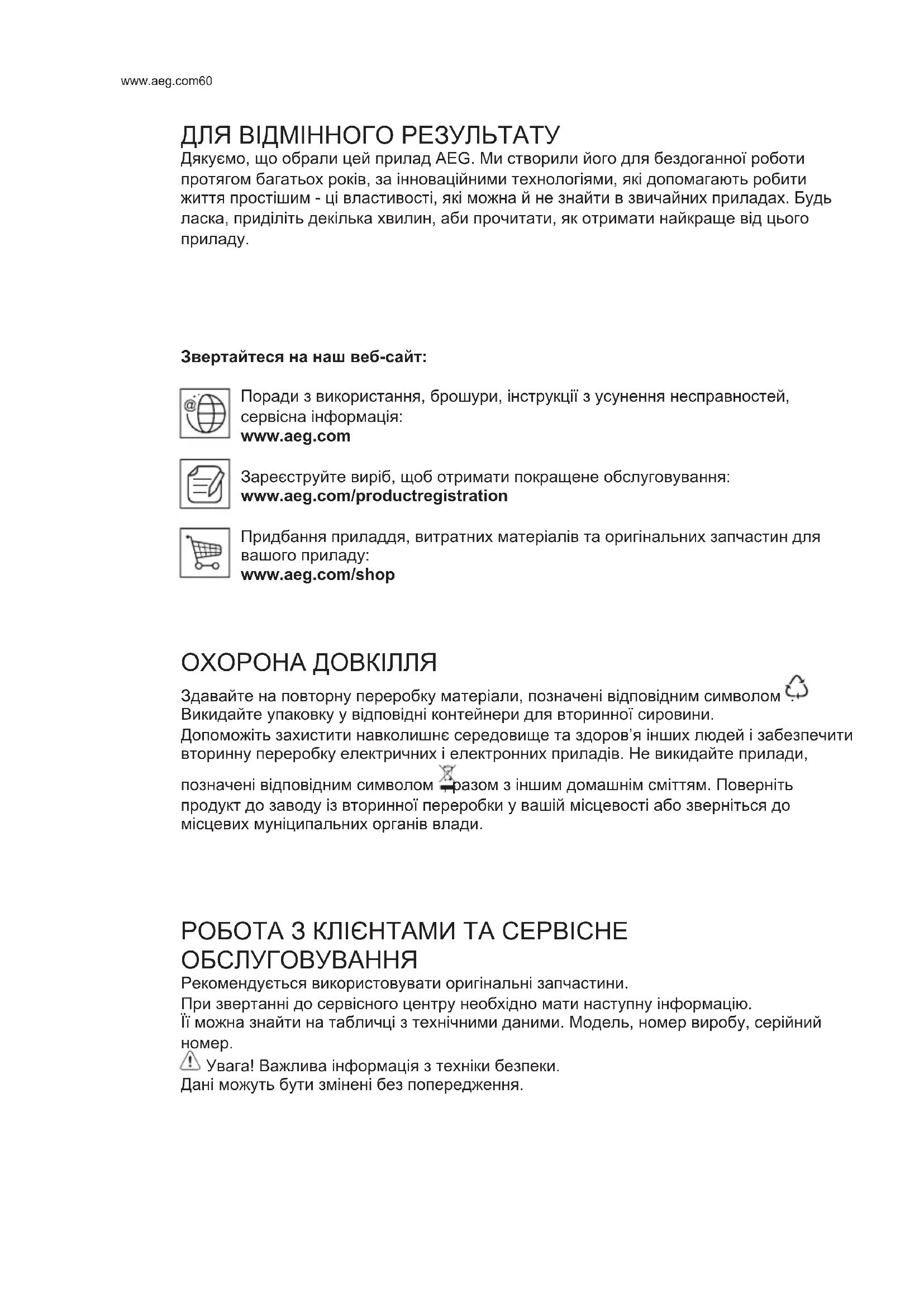 Звертайтеся на наш веб-сайт: Поради з використання, брошури, інструкції з усунення несправностей, сервісна інформація: www.aeg.com Зареєструйте виріб, щоб отримати покращене обслуговування: www.aeg.com/productregistration Придбання приладдя, витратних матеріалів та оригінальних запчастин для вашого приладу: www.aeg.com/shop ОХОРОНА ДОВКІЛЛЯ Здавайте на повторну переробку матеріали, позначені відповідним символом . Викидайте упаковку у відповідні контейнери для вторинної сировини. Допоможіть захистити навколишнє середовище та здоров’я інших людей і забезпечити вторинну переробку електричних і електронних приладів. Не викидайте прилади, позначені відповідним символом , разом з іншим домашнім сміттям. Поверніть продукт до заводу із вторинної переробки у вашій місцевості або зверніться до місцевих муніципальних органів влади. РОБОТА З КЛІЄНТАМИ ТА СЕРВІСНЕ ОБСЛУГОВУВАННЯ Рекомендується використовувати оригінальні запчастини. При звертанні до сервісного центру необхідно мати наступну інформацію. Її можна знайти на табличці з технічними даними. Модель, номер виробу, серійний