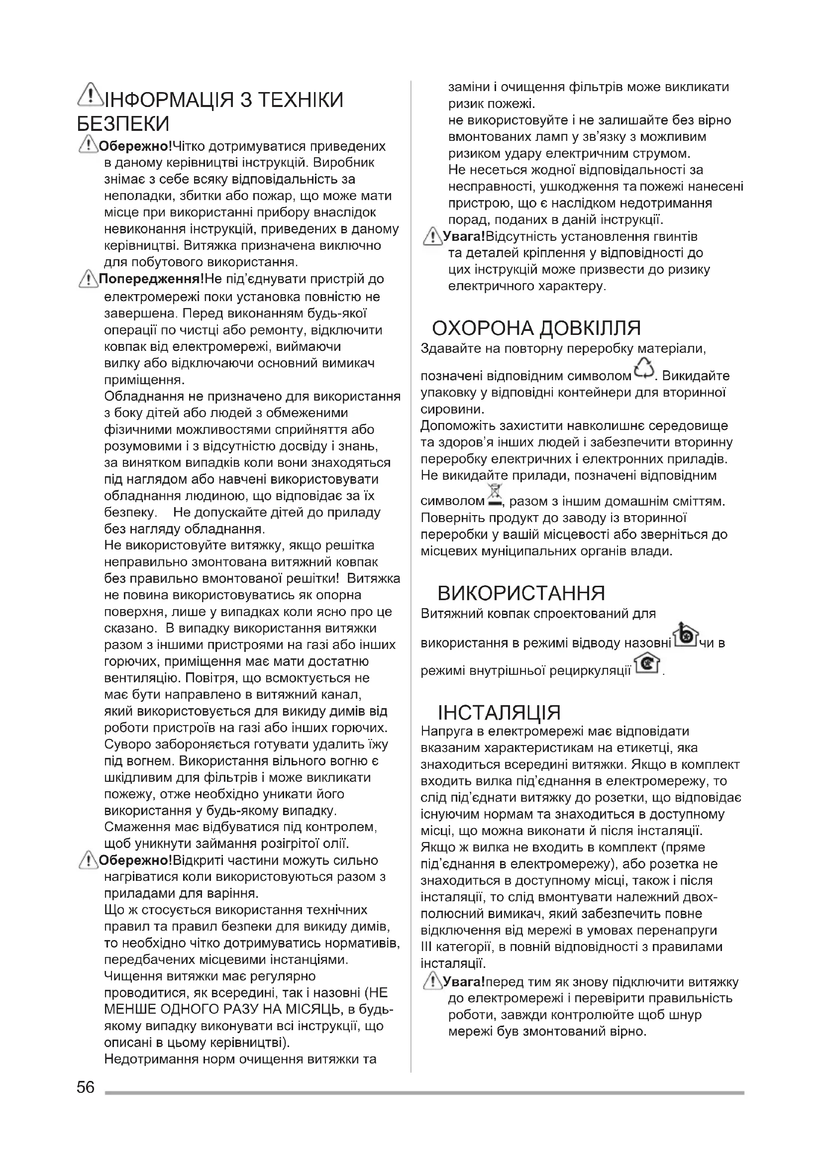 Обережно! Чітко дотримуватися приведених в даному керівництві інструкцій. Виробник знімає з себе всяку відповідальність за неполадки, збитки або пожар, що може мати місце при використанні прибору внаслідок невиконання інструкцій, приведених в даному керівництві. Витяжка призначена виключно для побутового використання. Попередження! Не під’єднувати пристрій до електромережі поки установка повністю не завершена. Перед виконанням будь-якої операції по чистці або ремонту, відключити ковпак від електромережі, виймаючи вилку або відключаючи основний вимикач приміщення. Обладнання не призначено для використання з боку дітей або людей з обмеженими фізичними можливостями сприйняття або розумовими і з відсутністю досвіду і знань, за винятком випадків коли вони знаходяться під наглядом або навчені використовувати обладнання людиною, що відповідає за їх безпеку. Не допускайте дітей до приладу без нагляду обладнання. Не використовуйте витяжку, якщо решітка неправильно змонтована витяжний ковпак без правильно вмонтованої решітки! Витяжка не повина використовуватись як опорна поверхня, лише у випадках коли ясно про це сказано. В випадку використання витяжки разом з іншими пристроями на газі або інших горючих, приміщення має мати достатню вентиляцію. Повітря, що всмоктується не має бути направлено в витяжний канал, який використовується для викиду димів від роботи пристроїв на газі або інших горючих. Суворо забороняється готувати удалить їжу під вогнем. Використання вільного вогню є шкідливим для фільтрів і може викликати пожежу, отже необхідно уникати його використання у будь-якому випадку. Смаження має відбуватися під контролем, щоб уникнути займання розігрітої олії. Обережно! Відкриті частини можуть сильно нагріватися коли використовуються разом з приладами для варіння. Що ж стосується використання технічних правил та правил безпеки для викиду димів, то необхідно чітко дотримуватись нормативів, передбачених місцевими інстанціями. Чищення витяжки має регулярно проводитися, як всередині, так і назовні (НЕ МЕНШЕ ОДНОГО РАЗУ НА МІСЯЦЬ, в будь- якому випадку виконувати всі інструкції, що описані в цьому керівництві). Недотримання норм очищення витяжки та заміни і очищення фільтрів може викликати ризик пожежі. не використовуйте і не залишайте без вірно вмонтованих ламп у зв’язку з можливим ризиком удару електричним струмом. Не несеться жодної відповідальності за несправності, ушкодження та пожежі нанесені пристрою, що є наслідком недотримання порад, поданих в даній інструкції. Увага! Відсутність установлення гвинтів та деталей кріплення у відповідності до цих інструкцій може призвести до ризику електричного характеру.