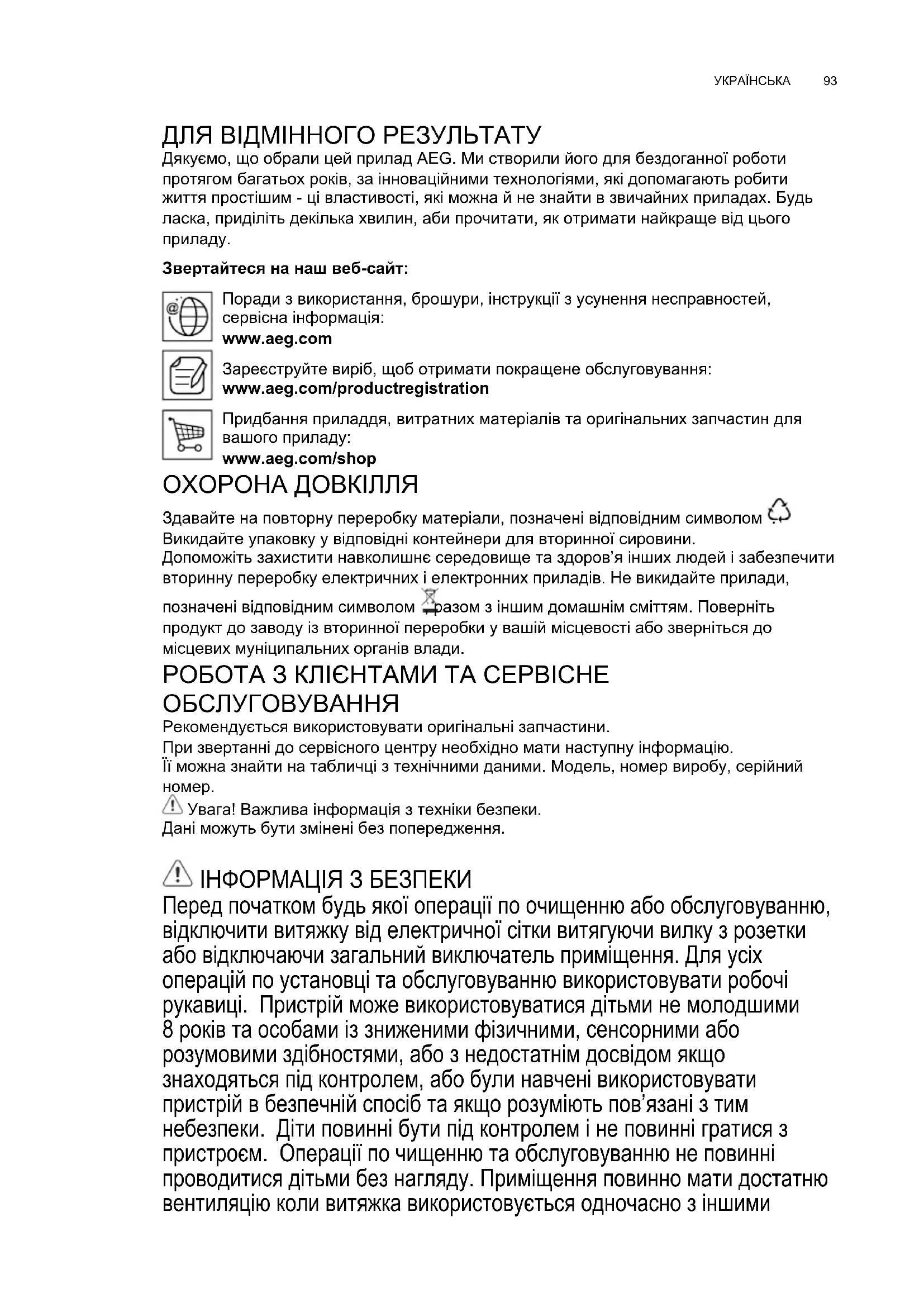 Увага! Важлива інформація з техніки безпеки. Дані можуть бути змінені без попередження. ІНФОРМАЦІЯ З БЕЗПЕКИ Перед початком будь якої операції по очищенню або обслуговуванню, відключити витяжку від електричної сітки витягуючи вилку з розетки або відключаючи загальний виключатель приміщення. Для усіх операцій по установці та обслуговуванню використовувати робочі рукавиці. Пристрій може використовуватися дітьми не молодшими 8 років та особами із зниженими фізичними, сенсорними або розумовими здібностями, або з недостатнім досвідом якщо знаходяться під контролем, або були навчені використовувати пристрій в безпечній спосіб та якщо розуміють пов’язані з тим небезпеки. Діти повинні бути під контролем і не повинні гратися з пристроєм. Операції по чищенню та обслуговуванню не повинні проводитися дітьми без нагляду. Приміщення повинно мати достатню вентиляцію коли витяжка використовується одночасно з іншими UK ІНСТРУКЦІЯ З ЕКСПЛУАТАЦІЇwww.aeg.com94 пристроями що працюють на газі або інших паливах. Витяжка повинна бути чищена всередині та назовні (ХОЧАБ ОДИН РАЗ НА МІСЯЦЬ), дотримуватися інструкцій по обслуговуванню приведених в цьому посібнику. Не дотримання норм чищення витяжки та заміни і чищення фільтрів може привести до загорання. Суворо заборонено приготування їди на відкритому вогні під витяжкою. кваліфікованим персоналом. УВАГА! Не встановлювання відповідних гвинтів і пристроїв для фіксування у відповідності з цими інструкціями може привести до ризиків електричного походження. 2.ВИКОРИСТАННЯ Витяжка служить для всмоктування кіптяви та пару, що утворюються під час приготування їжі. В інструкції, що додається вказується, в якому виконанні можна використовувати вашу модель - як витяжку з виведенням назовні або як витяжку з внутрішньою рециркуляцією повітря