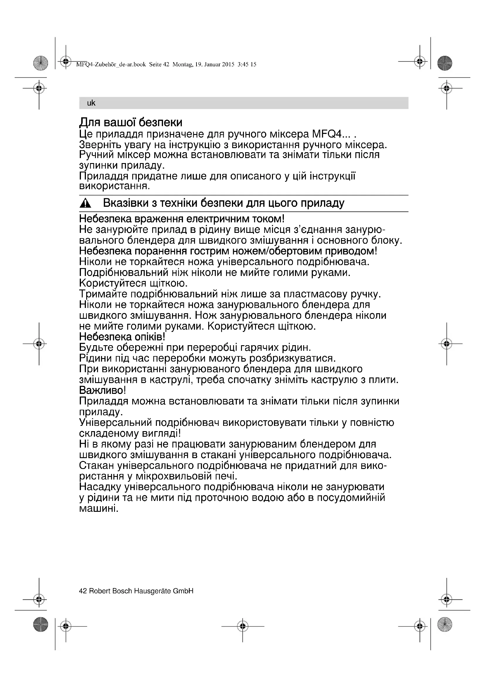MFQ4-Zubehör_de-ar.book Seite 42 Montag, 19. Januar 2015 3:45 15Robert Bosch Hausgeräte GmbH 43 Прочитайте уважно цю інструкцію перед використанням, щоб ознайомитися із важливими вказівками з техніки безпеки і управління для цього приладу. Зберігайте, будь ласка, інструкцію з вико-