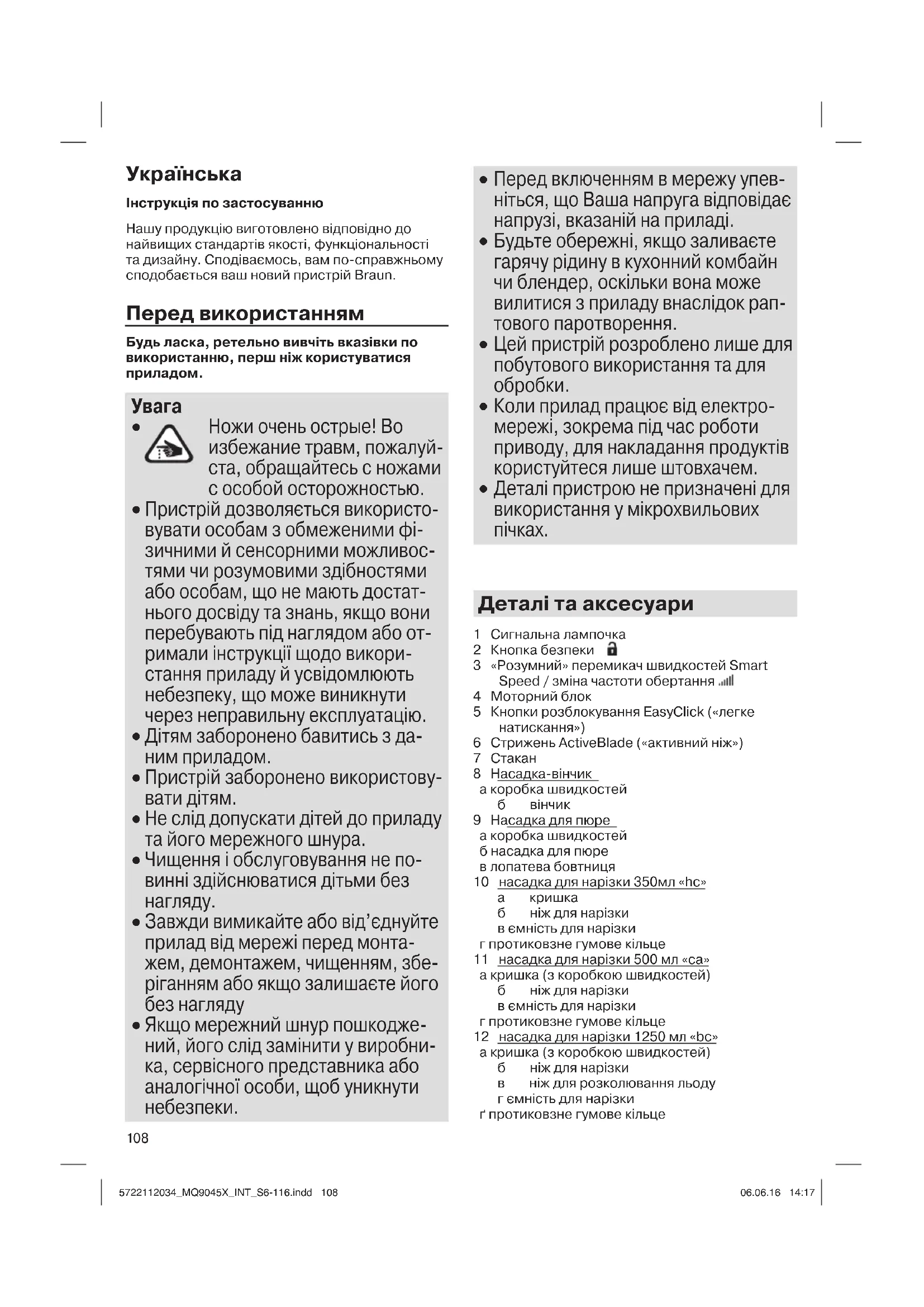 б ніж для нарізки в ємність для нарізки г протиковзне гумове кільце 11 насадка для нарізки 500 мл «ca» а кришка (з коробкою швидкостей) б ніж для нарізки в ємність для нарізки г протиковзне гумове кільце 12 насадка для нарізки 1250 мл «bc» а кришка (з коробкою швидкостей) б ніж для нарізки в ніж для розколювання льоду г ємність для нарізки ґ протиковзне гумове кільце 5722112034_MQ9045X_INT_S6-116.indd 1085722112034_MQ9045X_INT_S6-116.indd 108 06.06.16 14:1706.06.16 14:17109 Перед першим використанням вимийте всі деталі – дивіться розділ «Догляд та