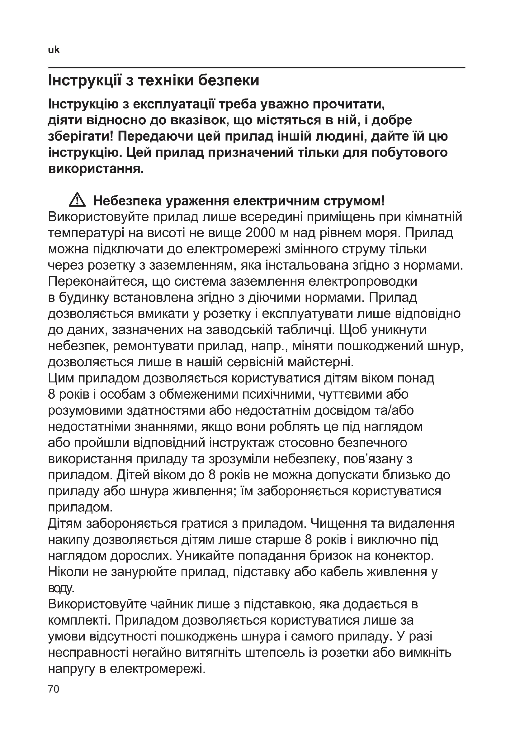 ukІнструкції з техніки безпеки Інструкцію з експлуатації треба уважно прочитати, діяти відносно до вказівок, що містяться в ній, і добре зберігати! Передаючи цей прилад іншій людині, дайте їй цю інструкцію. Цей прилад призначений тільки для побутового використання. W Небезпека ураження електричним струмом! Використовуйте прилад лише всередині приміщень при кімнатній температурі на висоті не вище 2000 м над рівнем моря. Прилад можна підключати до електромережі змінного струму тільки через розетку з заземленням, яка інстальована згідно з нормами. Пepeкoнaйтecя, щo cиcтeмa зaзeмлeння eлeктpoпpoвoдки в бyдинкy встановлена згiднo з дiючими нормами. Прилад дозволяється вмикати у розетку і експлуатувати лише відповідно до даних, зазначених на заводській табличці. Щоб уникнути небезпек, ремонтувати прилад, напр., міняти пошкоджений шнур, дозволяється лише в нашій сервісній майстерні. Цим приладом дозволяється користуватися дітям віком понад 8 років і особам з обмеженими психічними, чуттєвими або розумовими здатностями або недостатнім досвідом та/або недостатніми знаннями, якщо вони роблять це під наглядом або пройшли відповідний інструктаж стосовно безпечного використання приладу та зрозуміли небезпеку, пов’язану з приладом. Дітей віком до 8 років не можна допускати близько до приладу або шнура живлення; їм забороняється користуватися