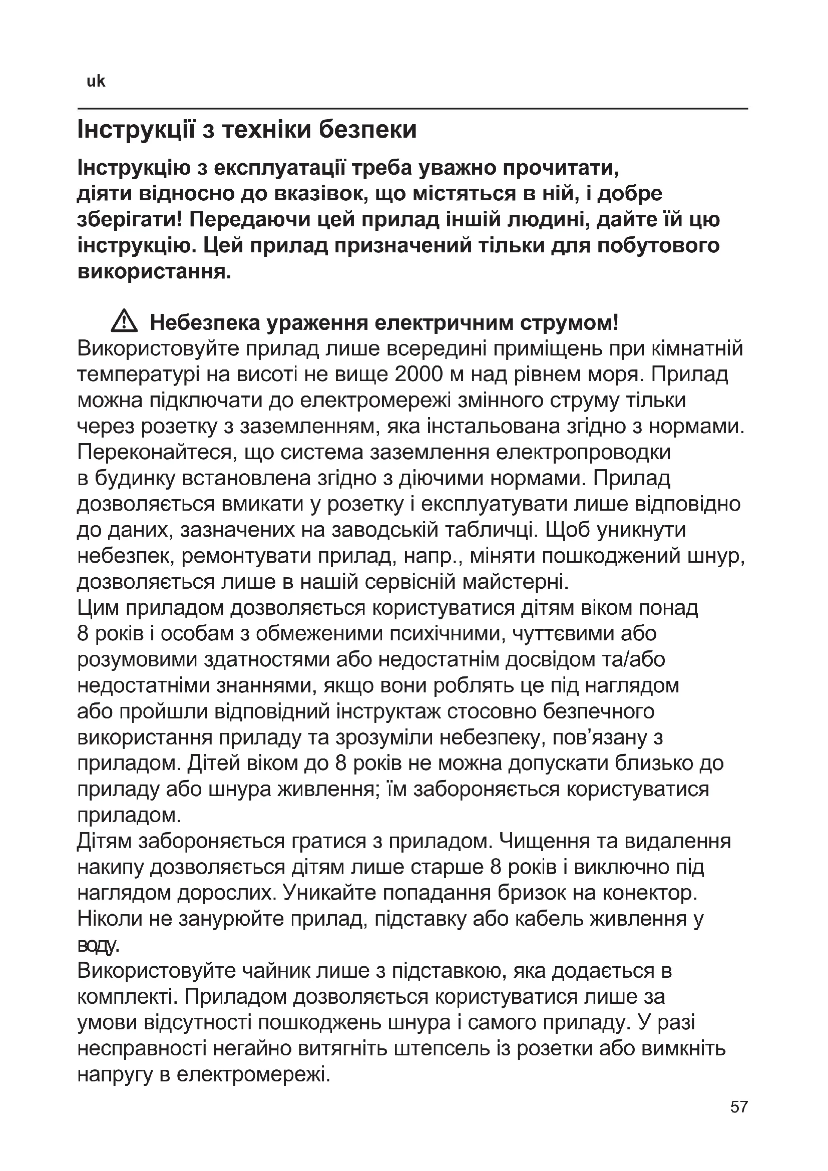 Дітям забороняється гратися з приладом. Чищення та видалення накипу дозволяється дітям лише старше 8 років і виключно під наглядом дорослих. Уникайте попадання бризок на конектор. Ніколи не занурюйте прилад, підставку або кабель живлення у