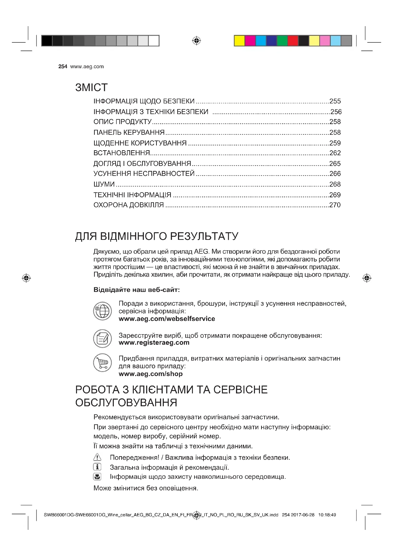- SWB66001DG-SWE66001DG_Wine_cellar_AEG_BG_CZ_DA_EN_FI_FR_HU_IT_NO_PL_RO_RU_SK_SV_UK.indd 253 2017-06-28 10:18:49254 www.aeg.com Дякуємо,щообралицейприладAEG.Мистворилийогодлябездоганноїроботи протягомбагатьохроків,заінноваційнимитехнологіями,якідопомагаютьробити життяпростішим—цевластивості,якіможнайнезнайтивзвичайнихприладах. Приділітьдекількахвилин,абипрочитати,якотриматинайкращевідцьогоприладу. Відвідайте наш веб-сайт: Порадизвикористання,брошури,інструкціїзусуненнянесправностей, сервіснаінформація: www.aeg.com/webselfservice Зареєструйтевиріб,щоботриматипокращенеобслуговування: www.registeraeg.com Придбанняприладдя,витратнихматеріалівіоригінальнихзапчастин длявашогоприладу: www.aeg.com/shop Рекомендуєтьсявикористовуватиоригінальнізапчастини. Призвертаннідосервісногоцентрунеобхідноматинаступнуінформацію: модель,номервиробу,серійнийномер. Їїможназнайтинатабличцізтехнічнимиданими. Попередження!/Важливаінформаціязтехнікибезпеки. Загальнаінформаціяйрекомендації. Інформаціящодозахистунавколишньогосередовища. Можезмінитисябезоповіщення. РОБОТАЗКЛІЄНТАМИТАСЕРВІСНЕ ОБСЛУГОВУВАННЯ ДЛЯВІДМІННОГОРЕЗУЛЬТАТУ ІНФОРМАЦІЯЩОДОБЕЗПЕКИ p. 255