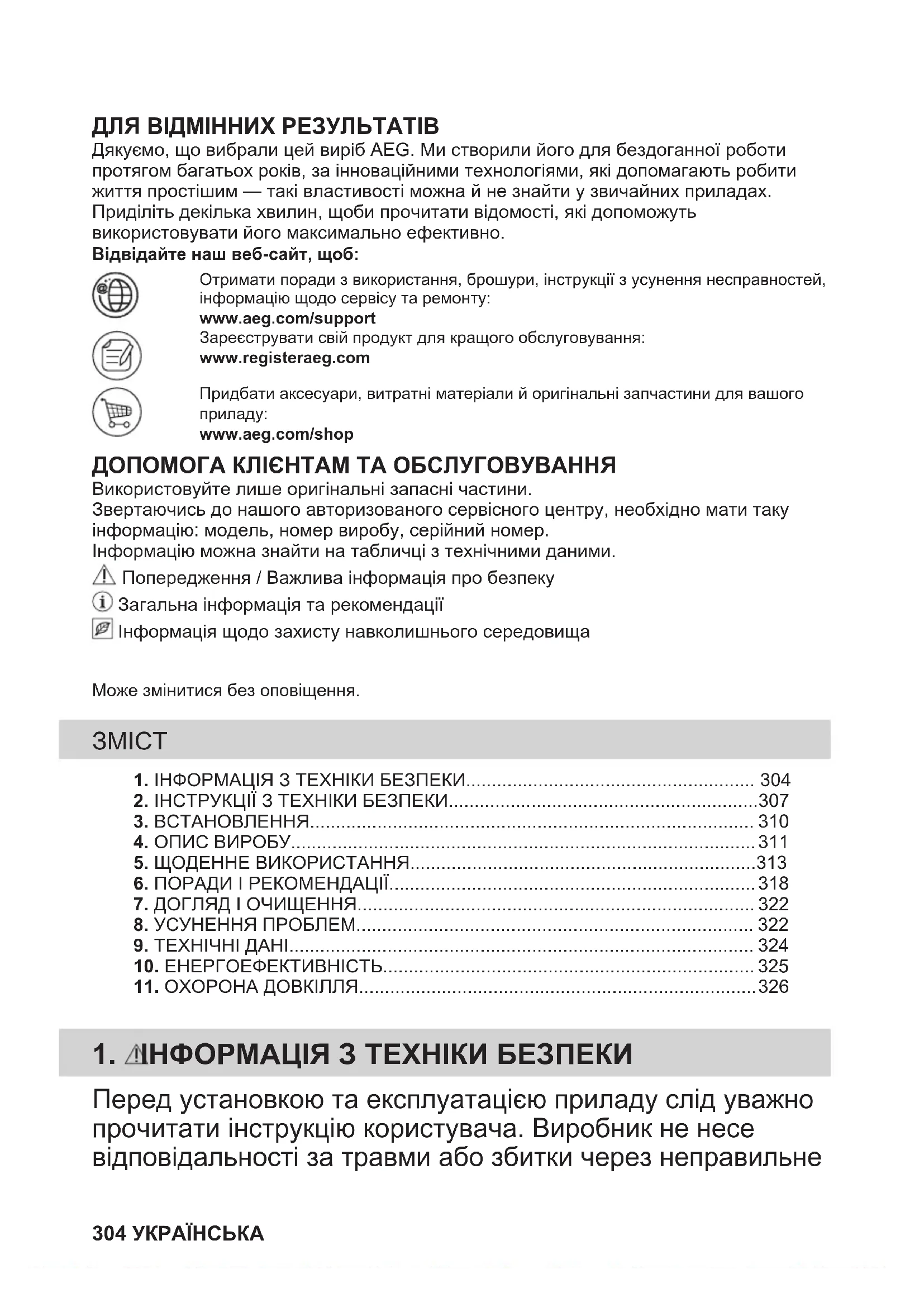 Recicle los materiales con el símbolo . Coloque el material de embalaje en los contenedores adecuados para su reciclaje. Ayude a proteger el medio ambiente y la salud pública, así como a reciclar residuos de aparatos eléctricos y electrónicos. No deseche los aparatos marcados con el símbolo junto con los residuos domésticos. Lleve el producto a su centro de reciclaje local o póngase en contacto con su oficina municipal. ESPAÑOL 303ДЛЯ ВІДМІННИХ РЕЗУЛЬТАТІВ Дякуємо, що вибрали цей виріб AEG. Ми створили його для бездоганної роботипротягом багатьох років, за інноваційними технологіями, які допомагають робитижиття простішим — такі властивості можна й не знайти у звичайних приладах.Приділіть декілька хвилин, щоби прочитати відомості, які допоможутьвикористовувати його максимально ефективно.Відвідайте наш веб-сайт, щоб:Отримати поради з використання, брошури, інструкції з усунення несправностей,інформацію щодо сервісу та ремонту:www.aeg.com/supportЗареєструвати свій продукт для кращого обслуговування:www.registeraeg.comПридбати аксесуари, витратні матеріали й оригінальні запчастини для вашогоприладу:www.aeg.com/shop ДОПОМОГА КЛІЄНТАМ ТА ОБСЛУГОВУВАННЯ Використовуйте лише оригінальні запасні частини.Звертаючись до нашого авторизованого сервісного центру, необхідно мати такуінформацію: модель, номер виробу, серійний номер.Інформацію можна знайти на табличці з технічними даними. Попередження / Важлива інформація про безпеку Загальна інформація та рекомендації Інформація щодо захисту навколишнього середовищаМоже змінитися без оповіщення. 1. ІНФОРМАЦІЯ З ТЕХНІКИ БЕЗПЕКИ........................................................ 3042. ІНСТРУКЦІЇ З ТЕХНІКИ БЕЗПЕКИ............................................................307