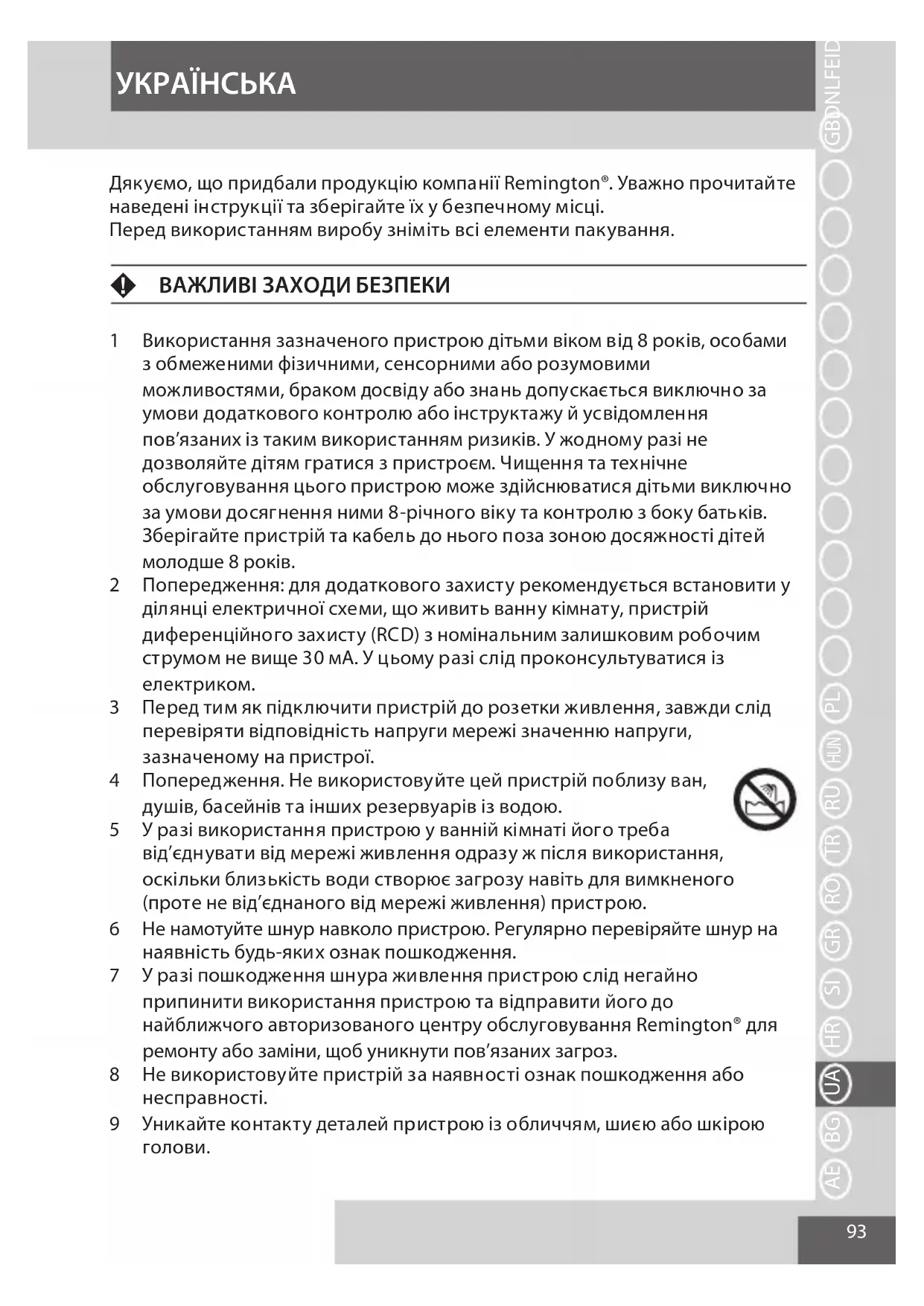 GBDNLFEIDKSFINPSKCZ HUN PLRUTRROGRSIBG HRUAAE Дякуємо, що придбали продукцію компанії Remington®. Уважно прочитайте наведені інструкції та зберігайте їх у безпечному місці. Перед використанням виробу зніміть всі елементи пакування. F ВАЖЛИВІ ЗАХОДИ БЕЗПЕКИ 1 Використання зазначеного пристрою дітьми віком від 8 років, особами з обмеженими фізичними, сенсорними або розумовими можливостями, браком досвіду або знань допускається виключно за умови додаткового контролю або інструктажу й усвідомлення пов’язаних із таким використанням ризиків. У жодному разі не дозволяйте дітям гратися з пристроєм. Чищення та технічне обслуговування цього пристрою може здійснюватися дітьми виключно за умови досягнення ними 8-річного віку та контролю з боку батьків. Зберігайте пристрій та кабель до нього поза зоною досяжності дітей молодше 8 років. 2 Попередження: для додаткового захисту рекомендується встановити у ділянці електричної схеми, що живить ванну кімнату, пристрій диференційного захисту (RCD) з номінальним залишковим робочим струмом не вище 30 мА. У цьому разі слід проконсультуватися із електриком. 3 Перед тим як підключити пристрій до розетки живлення, завжди слід перевіряти відповідність напруги мережі значенню напруги, зазначеному на пристрої. 4 Попередження. Не використовуйте цей пристрій поблизу ван, душів, басейнів та інших резервуарів із водою. 5 У разі використання пристрою у ванній кімнаті його треба від’єднувати від мережі живлення одразу ж після використання, оскільки близькість води створює загрозу навіть для вимкненого (проте не від’єднаного від мережі живлення) пристрою. 6 Не намотуйте шнур навколо пристрою. Регулярно перевіряйте шнур на наявність будь-яких ознак пошкодження. 7 У разі пошкодження шнура живлення пристрою слід негайно припинити використання пристрою та відправити його до найближчого авторизованого центру обслуговування Remington® для ремонту або заміни, щоб уникнути пов’язаних загроз. 8 Не використовуйте пристрій за наявності ознак пошкодження або несправності. 9 Уникайте контакту деталей пристрою із обличчям, шиєю або шкірою голови.94