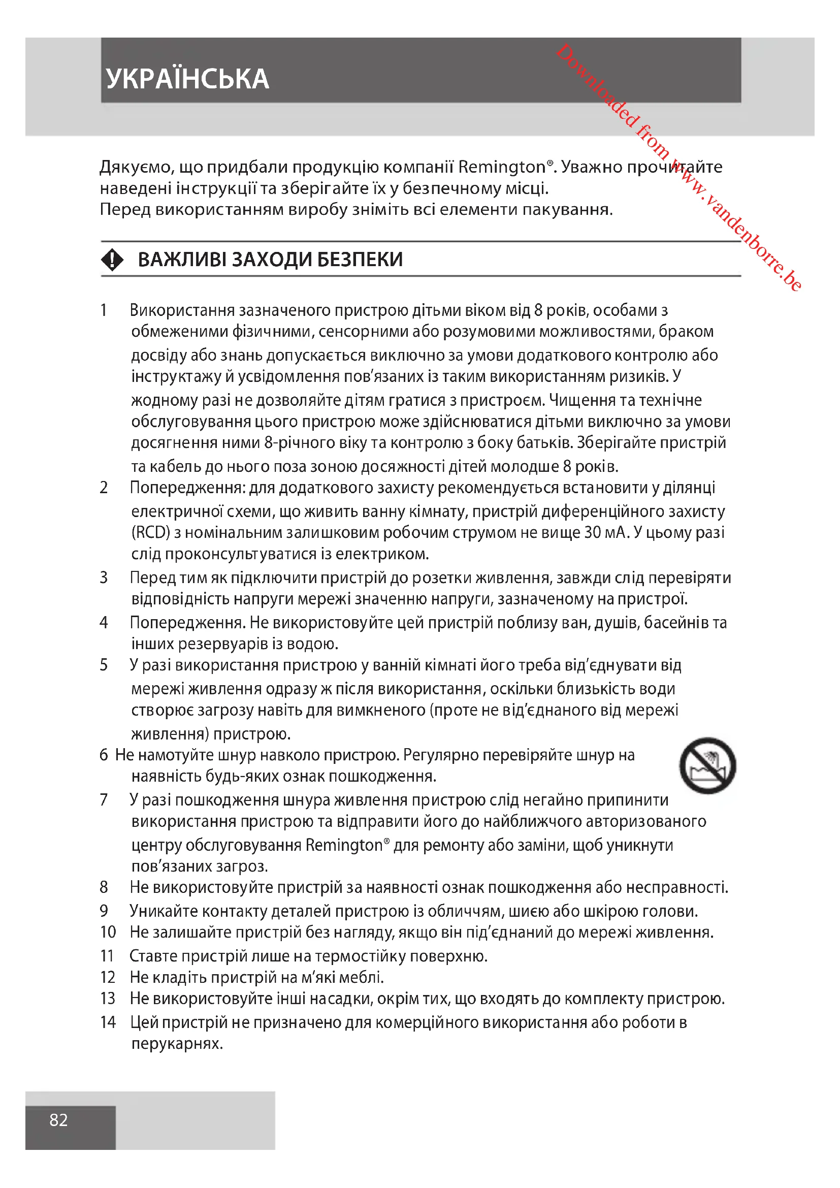 Дякуємо, що придбали продукцію компанії Remington®. Уважно прочитайте наведені інструкції та зберігайте їх у безпечному місці . Перед використанням виробу зніміть всі елементи пакування. F ВАЖЛИВІ ЗАХОДИ БЕЗПЕКИ 1 Використання зазначеного пристрою дітьми віком від 8 років, особами з обмеженими фізичними, сенсорними або розумовими можливостями, браком досвіду або знань допускається виключно за умови додаткового контролю або інструктажу й усвідомлення пов’язаних із таким використанням ризиків. У жодному разі не дозволяйте дітям гратися з пристроєм. Чищення та технічне обслуговування цього пристрою може здійснюватися дітьми виключно за умови досягнення ними 8-річного віку та контролю з боку батьків. Зберігайте пристрій та кабель до нього поза зоною досяжності дітей молодше 8 років. 2 Попередження: для додаткового захисту рекомендується встановити у ділянці електричної схеми, що живить ванну кімнату, пристрій диференційного захисту (RCD) з номінальним залишковим робочим струмом не вище 30 мА. У цьому разі слід проконсультуватися із електриком. 3 Перед тим як підключити пристрій до розетки живлення, завжди слід перевіряти відповідність напруги мережі значенню напруги, зазначеному на пристрої. 4 Попередження. Не використовуйте цей пристрій поблизу ван, душів, басейнів та інших резервуарів і з водою. 5 У разі використання пристрою у ванній кімнаті його треба від’єднувати від мережі живлення одразу ж після використання, оскільки близькість води створює загрозу навіть для вимкненого (проте не від’єднаного від мережі живлення) пристрою. 6 Не намотуйте шнур навколо пристрою. Регулярно перевіряйте шнур на наявність будь-яких ознак пошкодження. 7 У разі пошкодження шнура живлення пристрою слід негайно припинити використання пристрою та відправити його до найближчого авторизованого центру обслуговування Remington® для ремонту або заміни, щоб уникнути пов’язаних загроз. 8 Не використовуйте пристрій за наявності ознак пошкодження або несправності. 9 Уникайте контакту деталей пристрою із обличчям, шиєю або шкірою голови. 10 Не залишайте пристрій без нагляду, якщо він під’єднаний до мережі живлення. 11 Ставте пристрій лише на термостійку поверхню. 12 Не кладіть пристрій на м’які меблі. 13 Не використовуйте інші насадки, окрім тих, що входять до комплекту пристрою. 14 Цей пристрій не призначено для комерці йного використання або роботи в перукарнях. Downloaded from www.vandenborre.be83